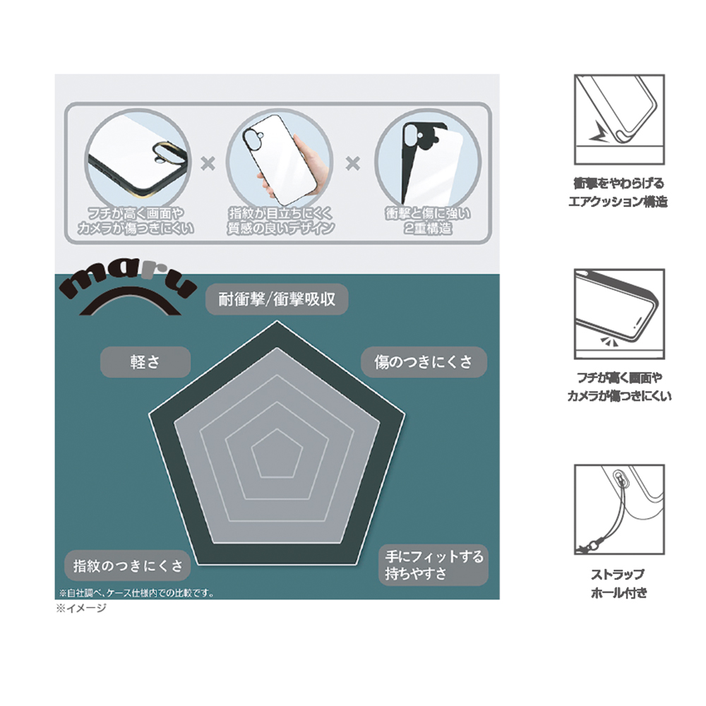 フチが高く画面やカメラが傷つきにくい。指紋が目立ちにくく質感の良いデザイン。衝撃と傷に強い2重構造。衝撃をやわらげるエアクッション構造。