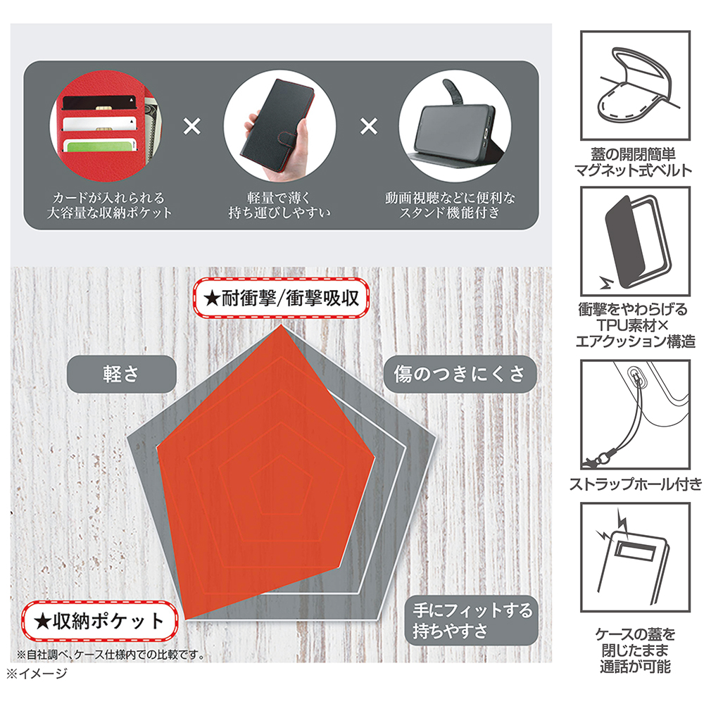 衝撃に強く、日常使いに便利な多機能手帳型ケース。