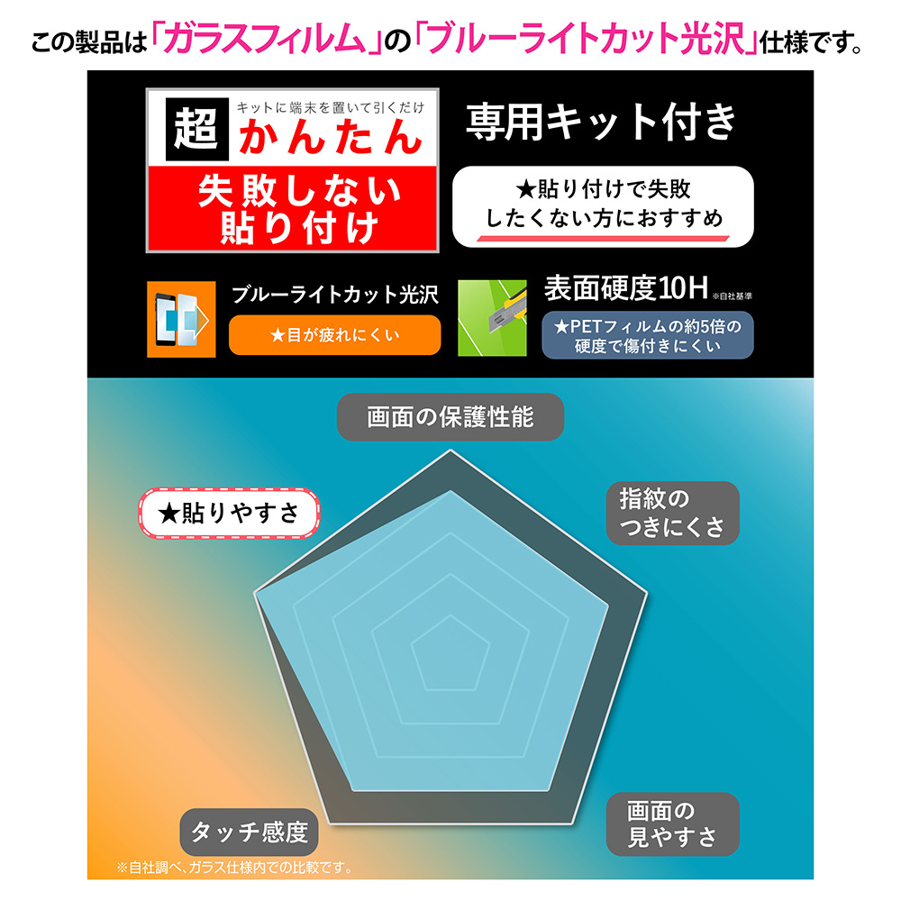 高い透明感に加えて、目に優しいブルーライトカット光沢タイプのガラスフィルム。