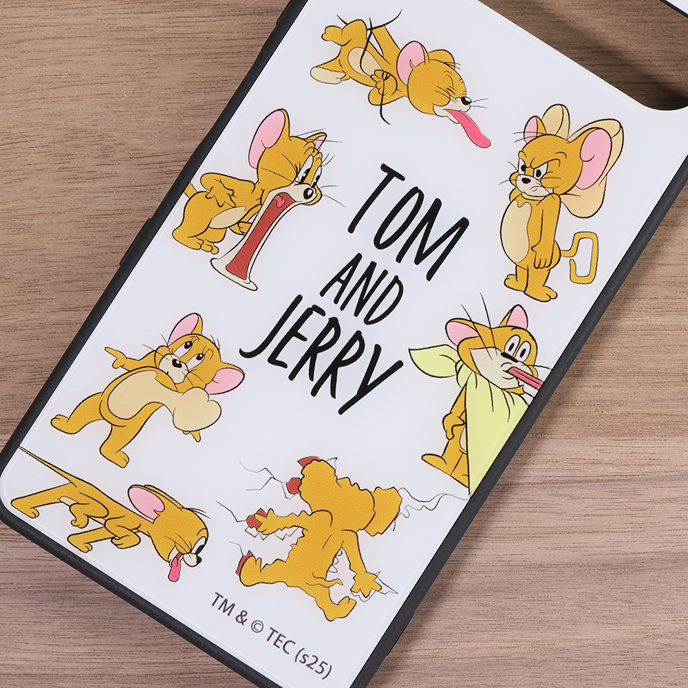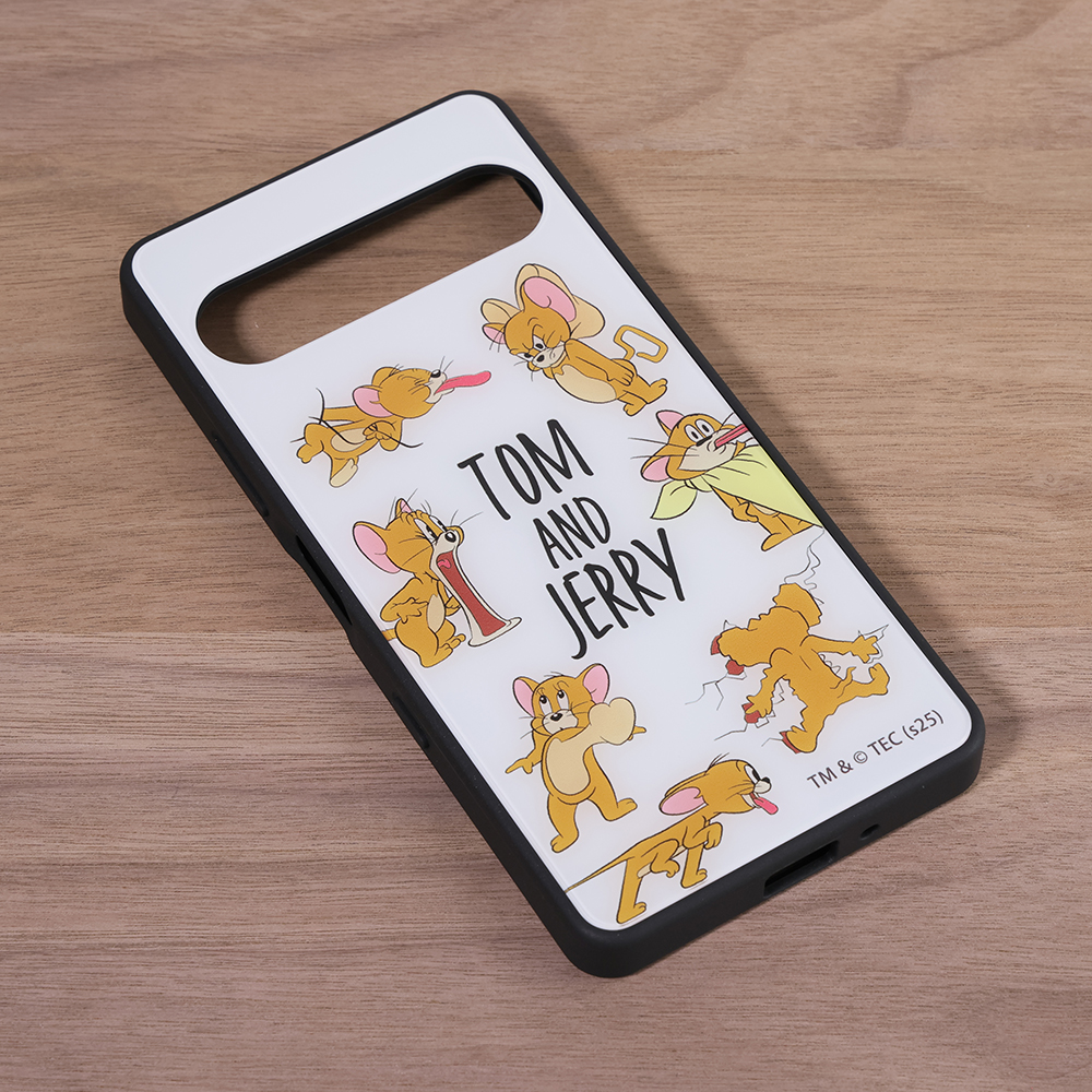 表面硬度2Hの背面にいろんな表情やポーズをとったジェリーのデザインをあしらったハイブリッドケース。