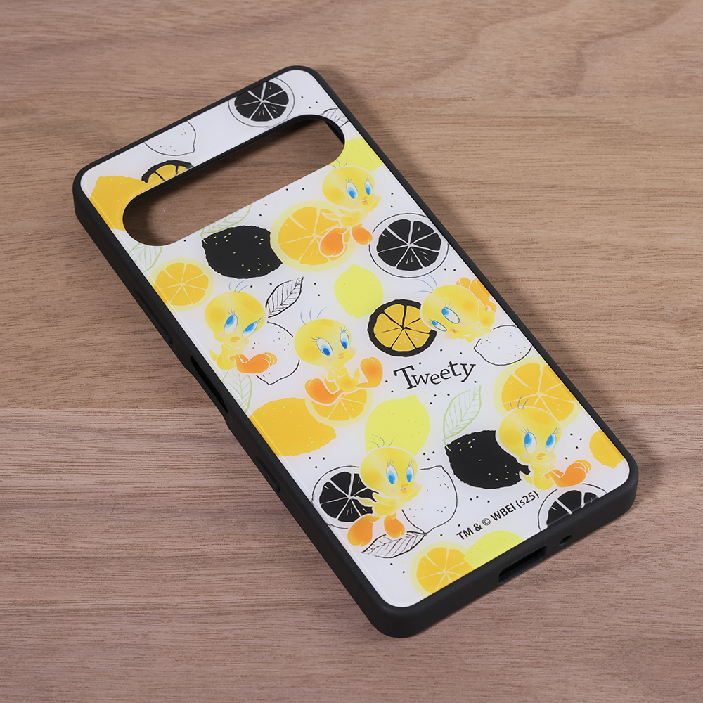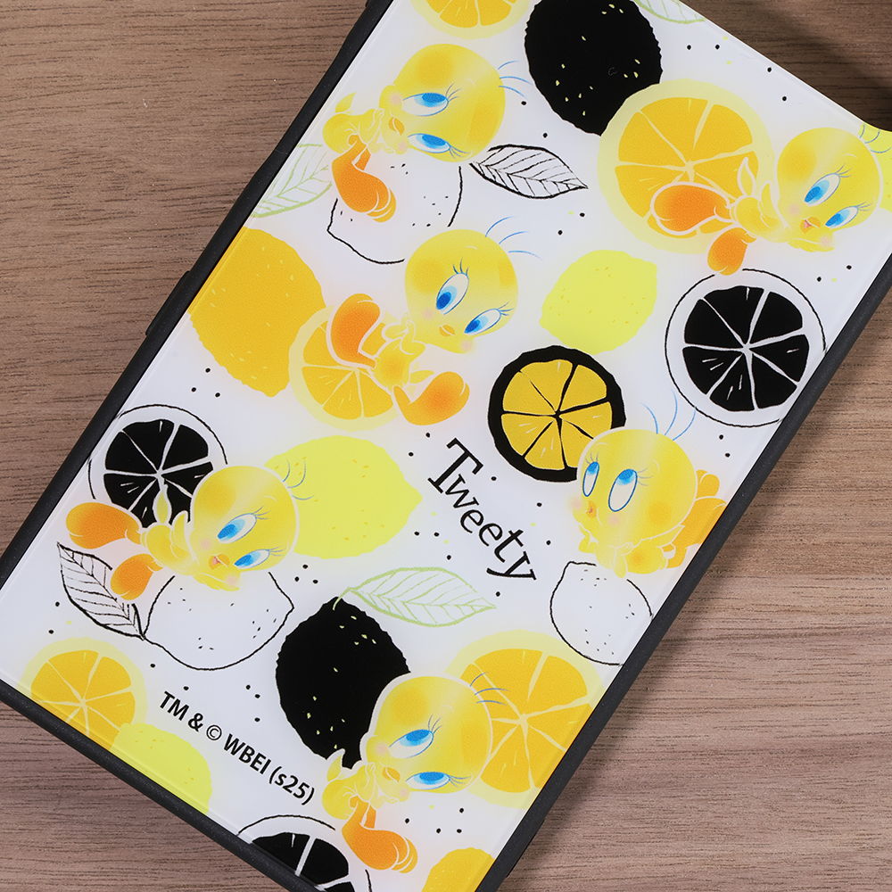 表面硬度2Hの背面に、トゥイーティーがちりばめられた、キュートな総柄デザインをあしらったハイブリッドケース。
