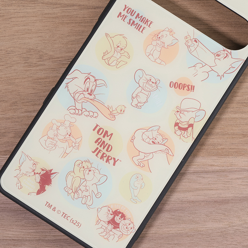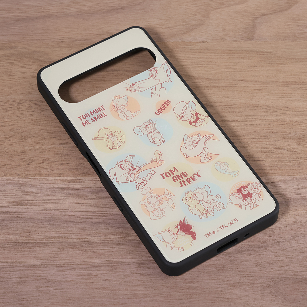 表面硬度2Hの背面に、トムとジェリーとフレンズたちが可愛いらしいデザインをあしらったハイブリッドケース。