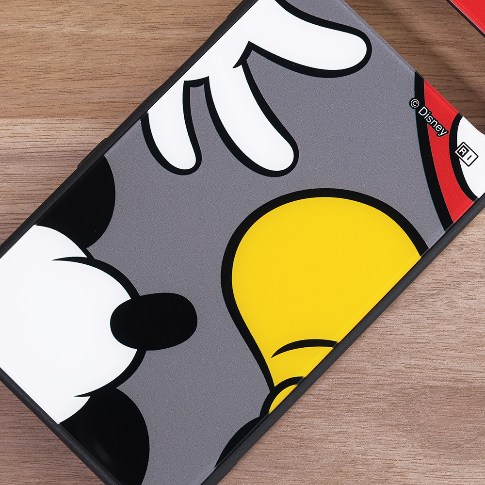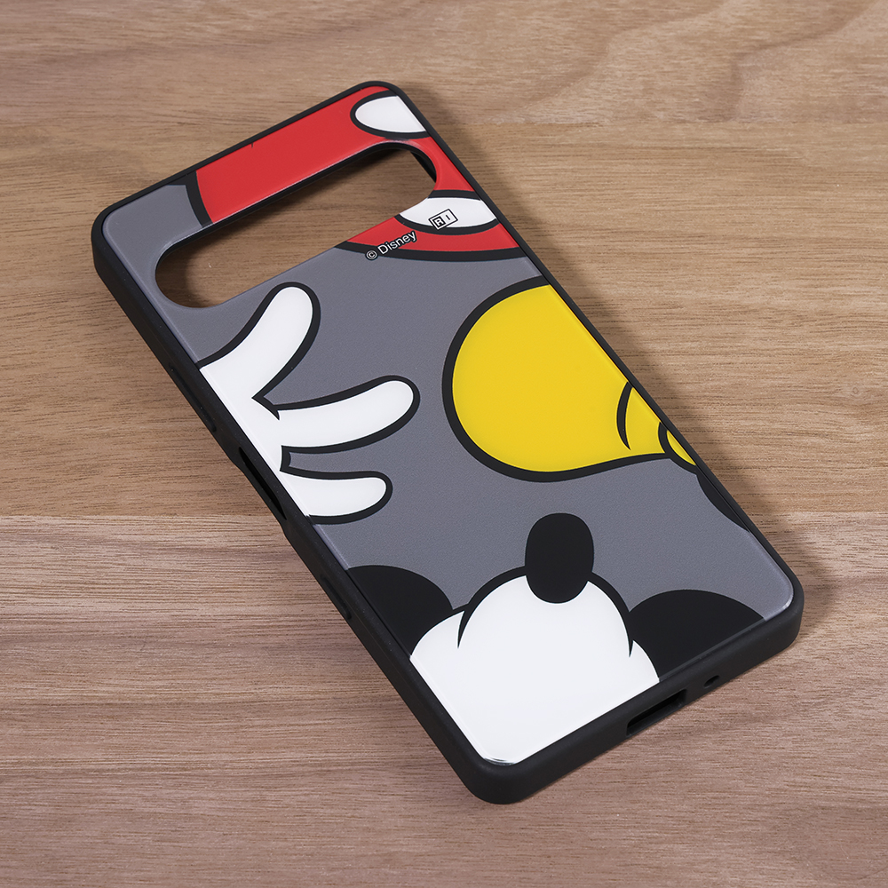 表面硬度2Hの背面に、ミッキーマウスのアイコニックなパーツを大胆に切り取った、ポップでユニークなデザインをあしらったハイブリッドケース。