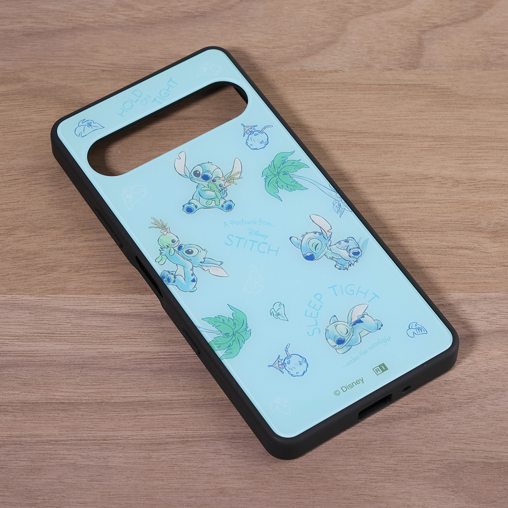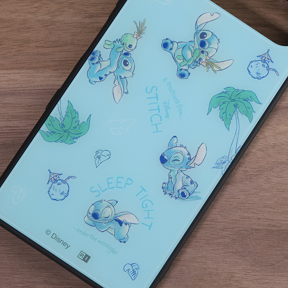 表面硬度2Hの背面に、スティッチがのんびり南国で楽しんでいる様子を表現したデザインをあしらったハイブリッドケース。