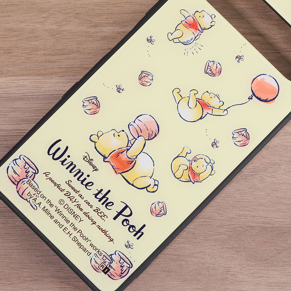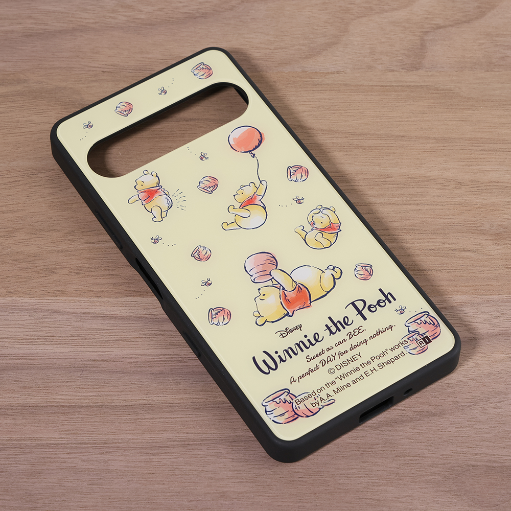 表面硬度2Hの背面に、プーさんとはちみつの壺や風船などプーさんらしいアイテムを散りばめて心が和むようなデザインをあしらったハイブリッドケース。