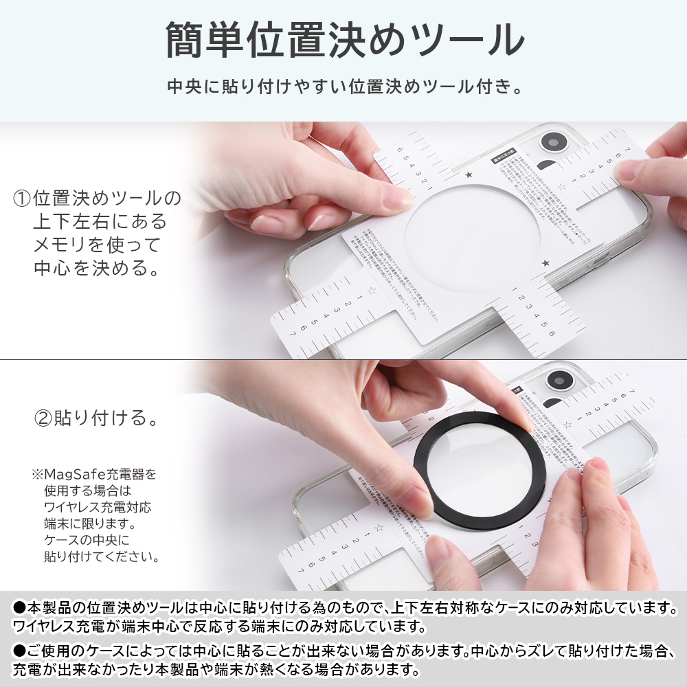 貼り付けるだけでお使いのスマートフォンをマグネット式アクセサリー(MagSafe等)対応にするリングステッカー。簡単位置決めツール付き。