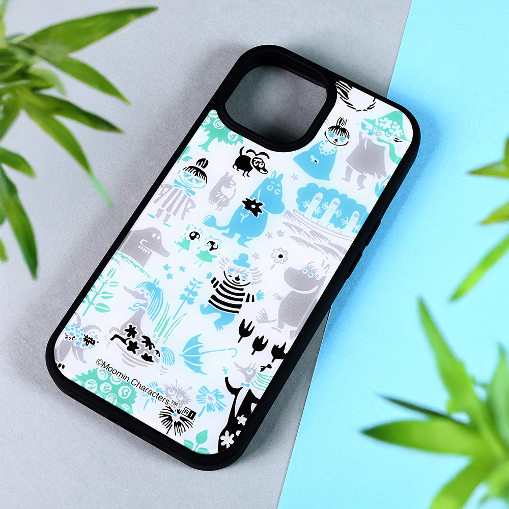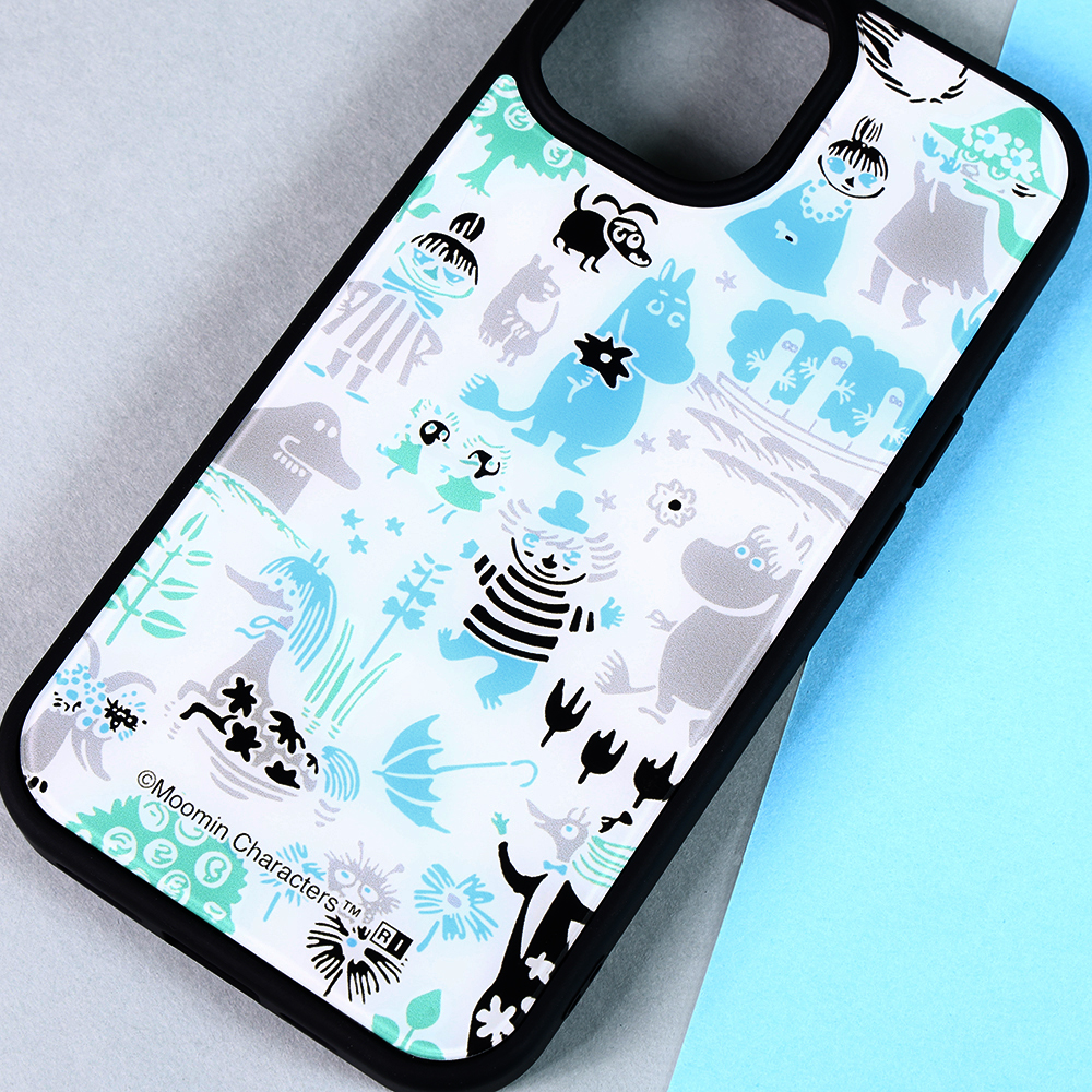 表面硬度2Hの背面に落ち着いた色合いとシンプルなパターンで、ムーミンたちの魅力をさりげなく取り入れたデザインをあしらったハイブリッドケース。