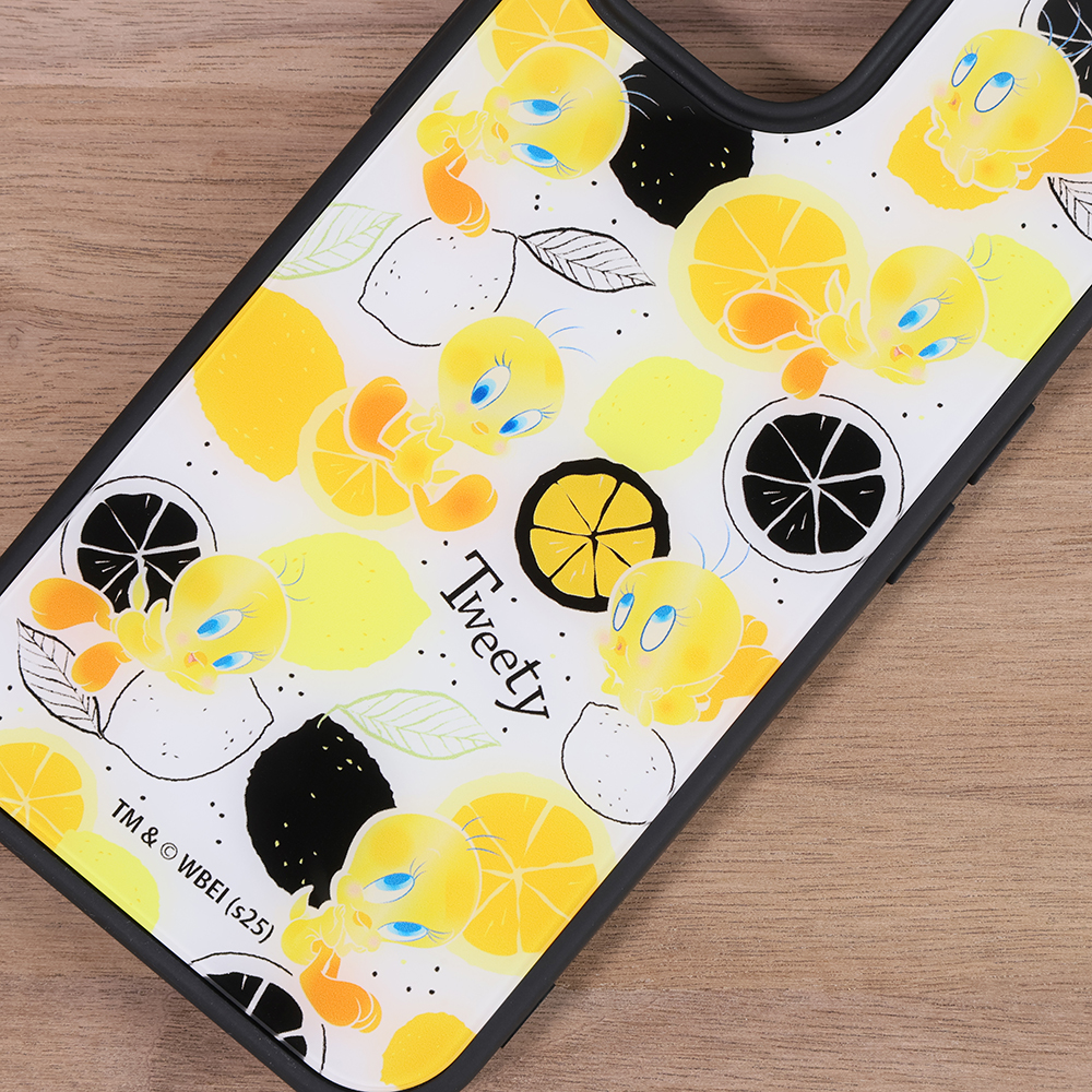表面硬度2Hの背面に、トゥイーティーがちりばめられた、キュートな総柄デザインをあしらったハイブリッドケース。