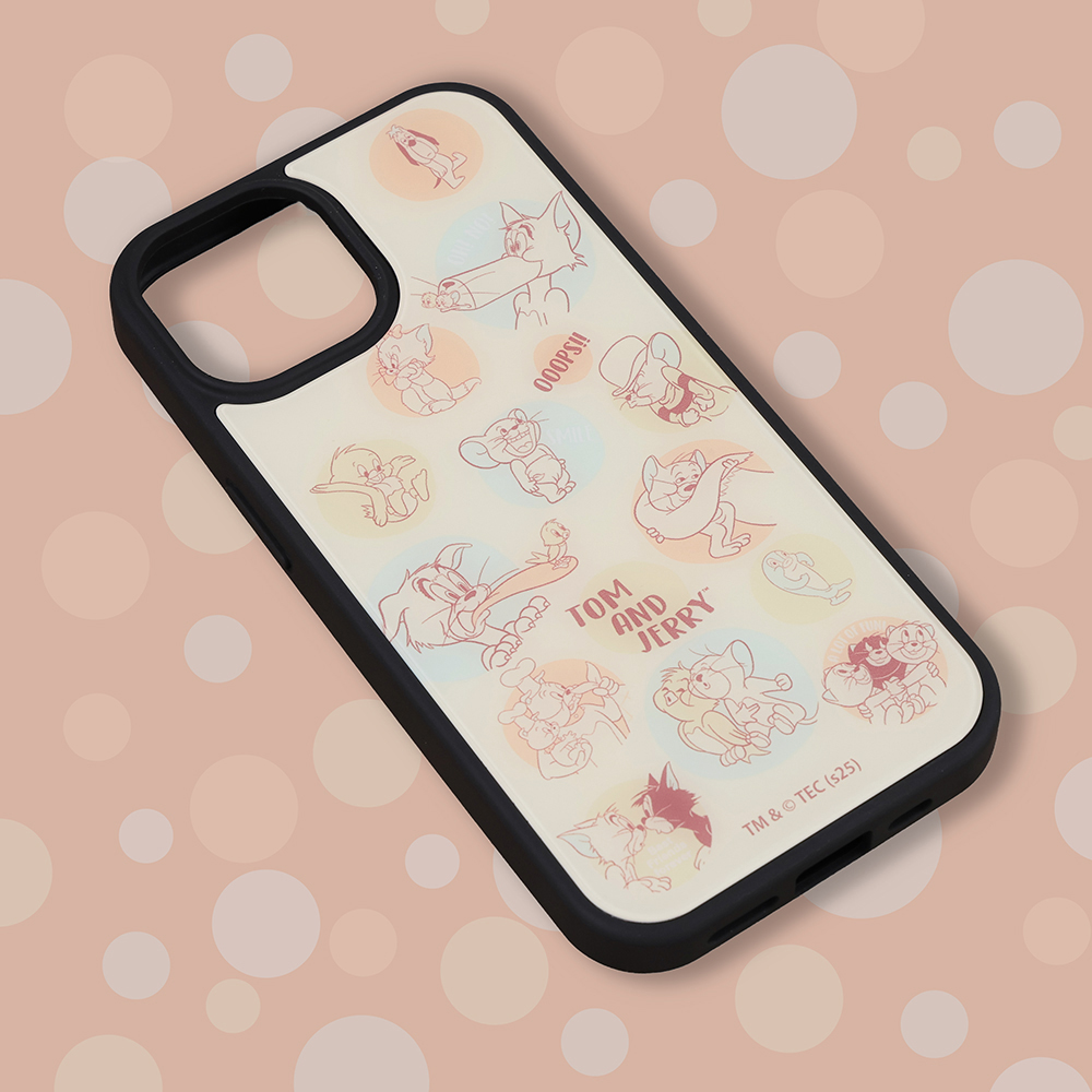 表面硬度2Hの背面に、トムとジェリーとフレンズたちが可愛いらしいデザインをあしらったハイブリッドケース。