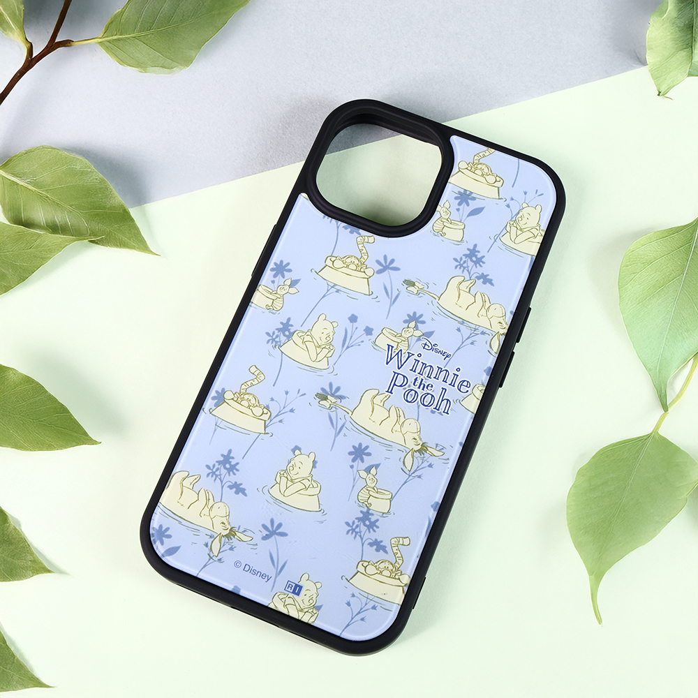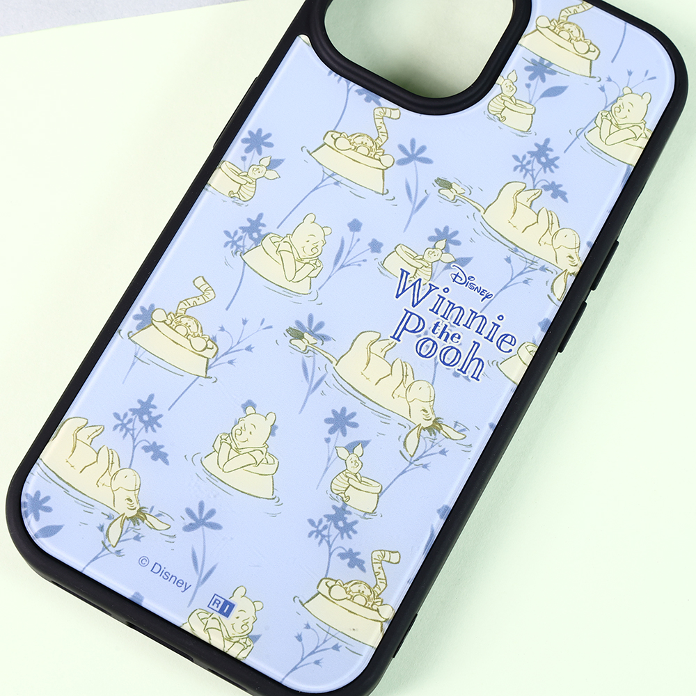 表面硬度2Hの背面に、それぞれの個性表れる浮き方で川を流れているプー、ピグレット、ティガー、イーヨーとさりげない花柄とロゴのデザインをあしらったハイブリッドケース。