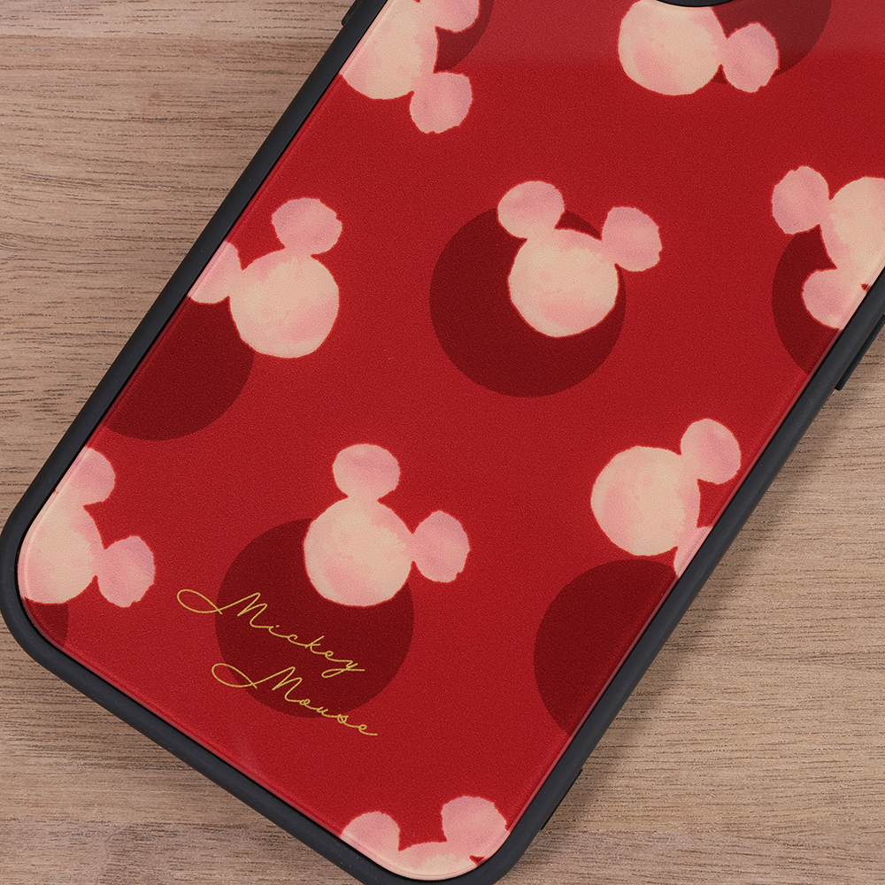 表面硬度2Hの背面に、ミッキーのドットアイコンのデザインをあしらったハイブリッドケース。