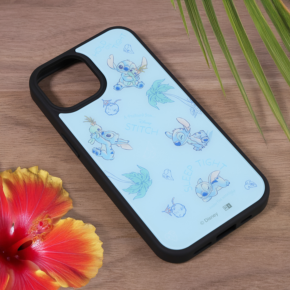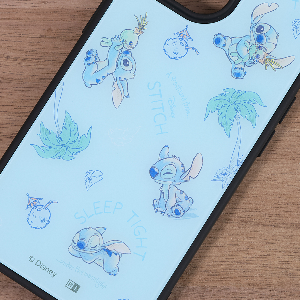 表面硬度2Hの背面に、スティッチがのんびり南国で楽しんでいる様子を表現したデザインをあしらったハイブリッドケース。