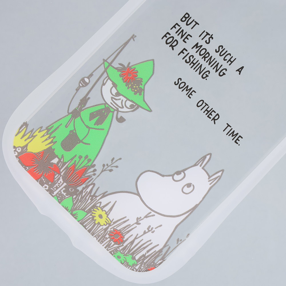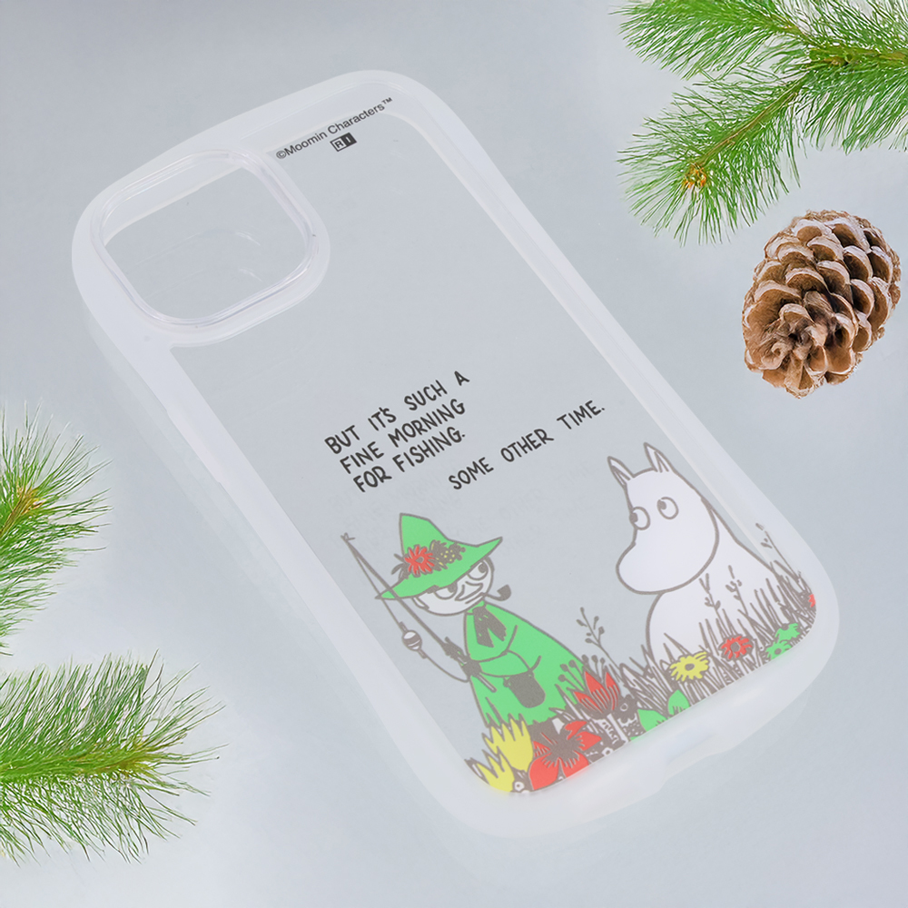 ムーミンとスナフキンが見つめ合い話合う姿が可愛いらしいデザインと、衝撃に強い安心感を兼ね備えたハイブリッドケース。
