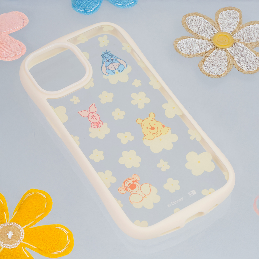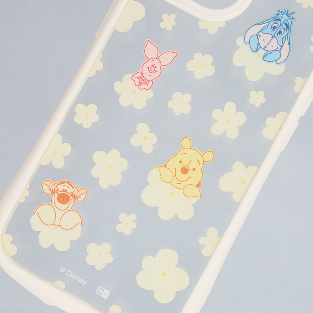 プーと仲間達が花に乗ってこちらを覗いているような可愛らしいデザインで、衝撃に強く、フィット感にも優れたハイブリッドケース。