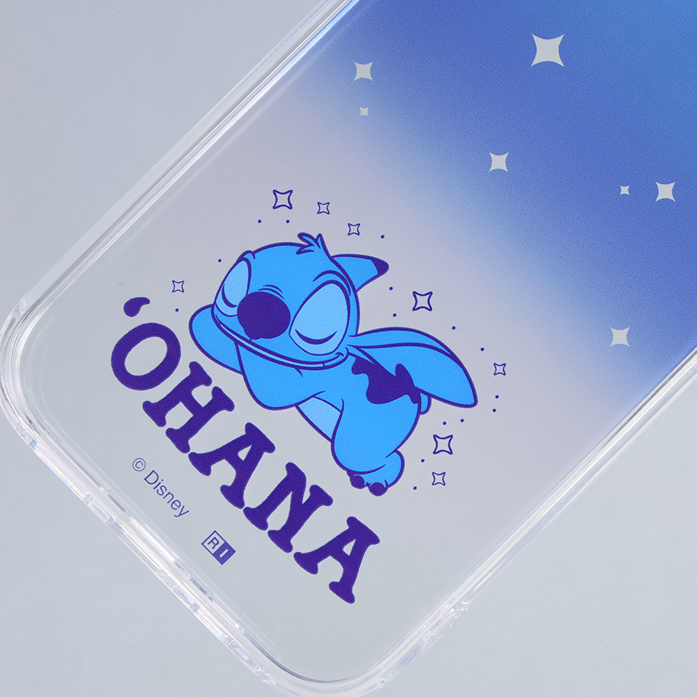 ビーチハウスの屋上にある展望台から見える星空のイメージと眠り姿のスティッチのデザインが楽しめる透明感のあるハイブリッドケース。