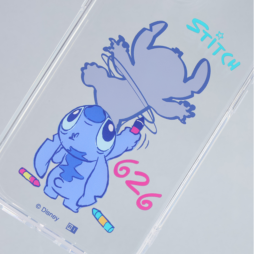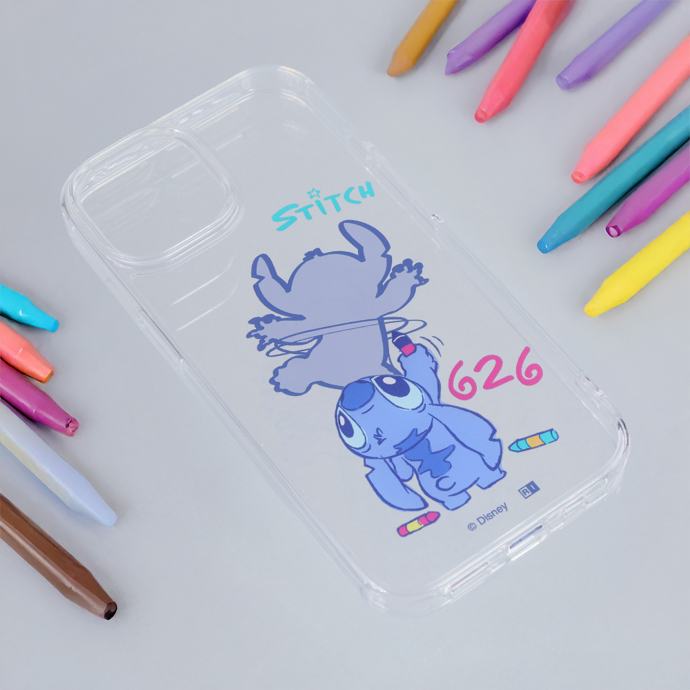 お絵描きが好きなスティッチが、自分自身を描いている、遊び心たっぷりのデザインが楽しめる透明感のあるハイブリッドケース。