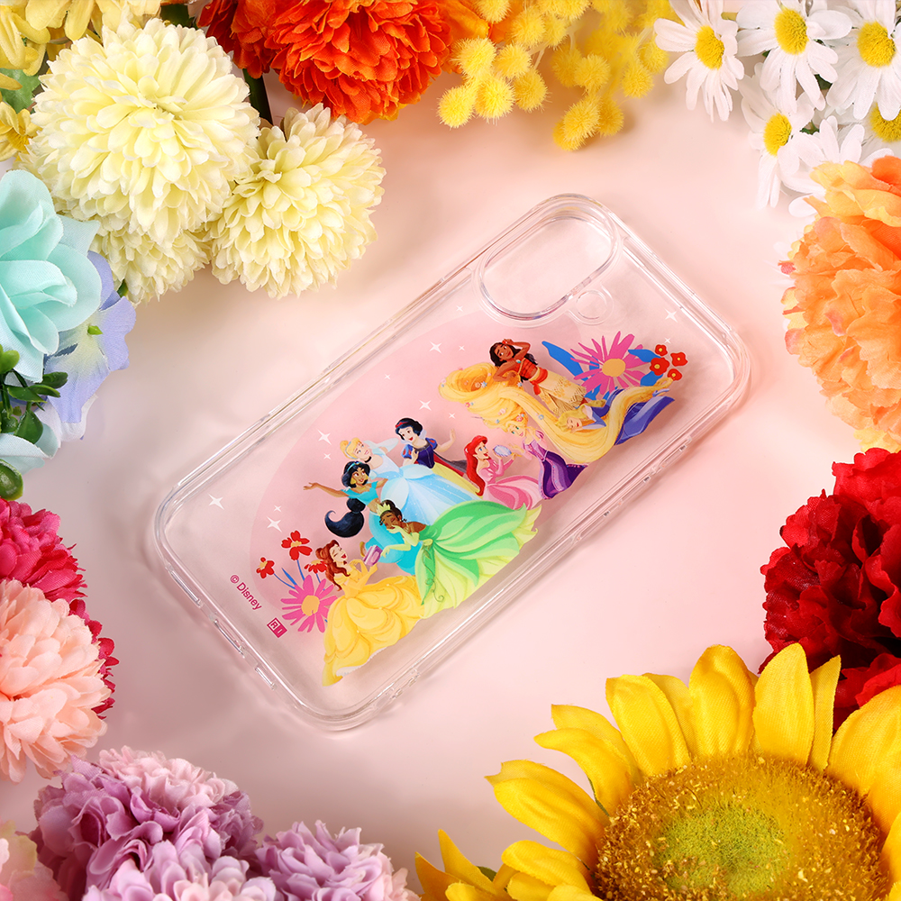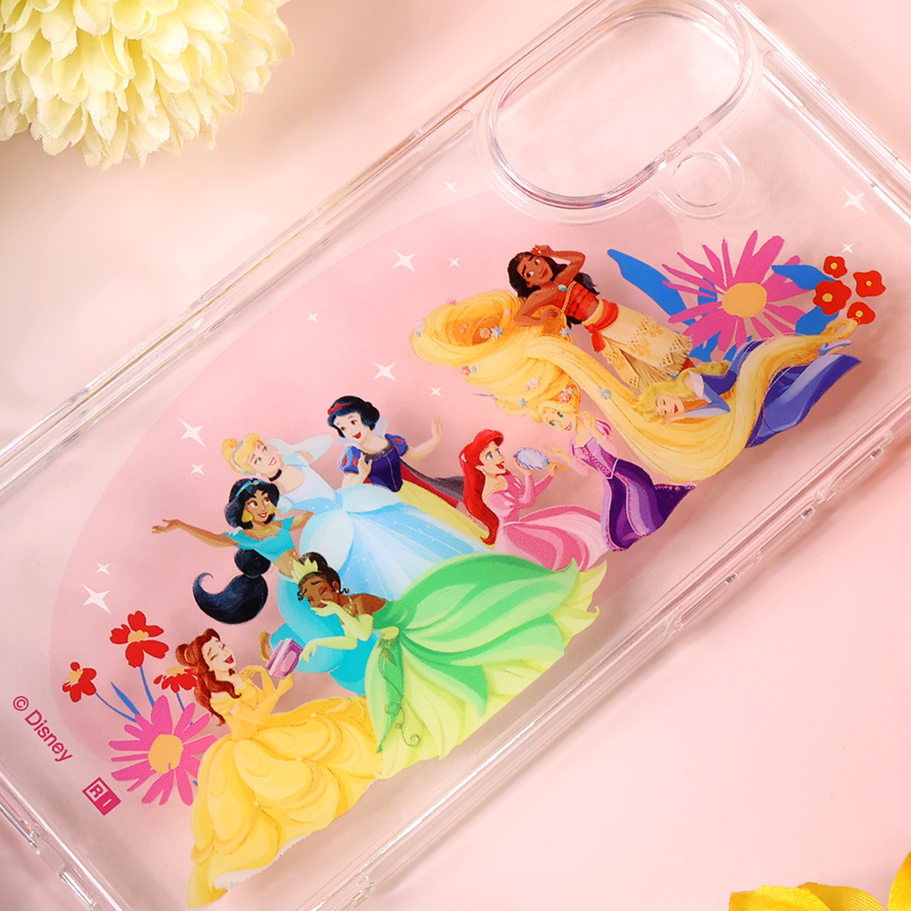 様々な作品のプリンセスが集合したアートを使用した可愛らしいデザインが楽しめる透明感のあるハイブリッドケース。