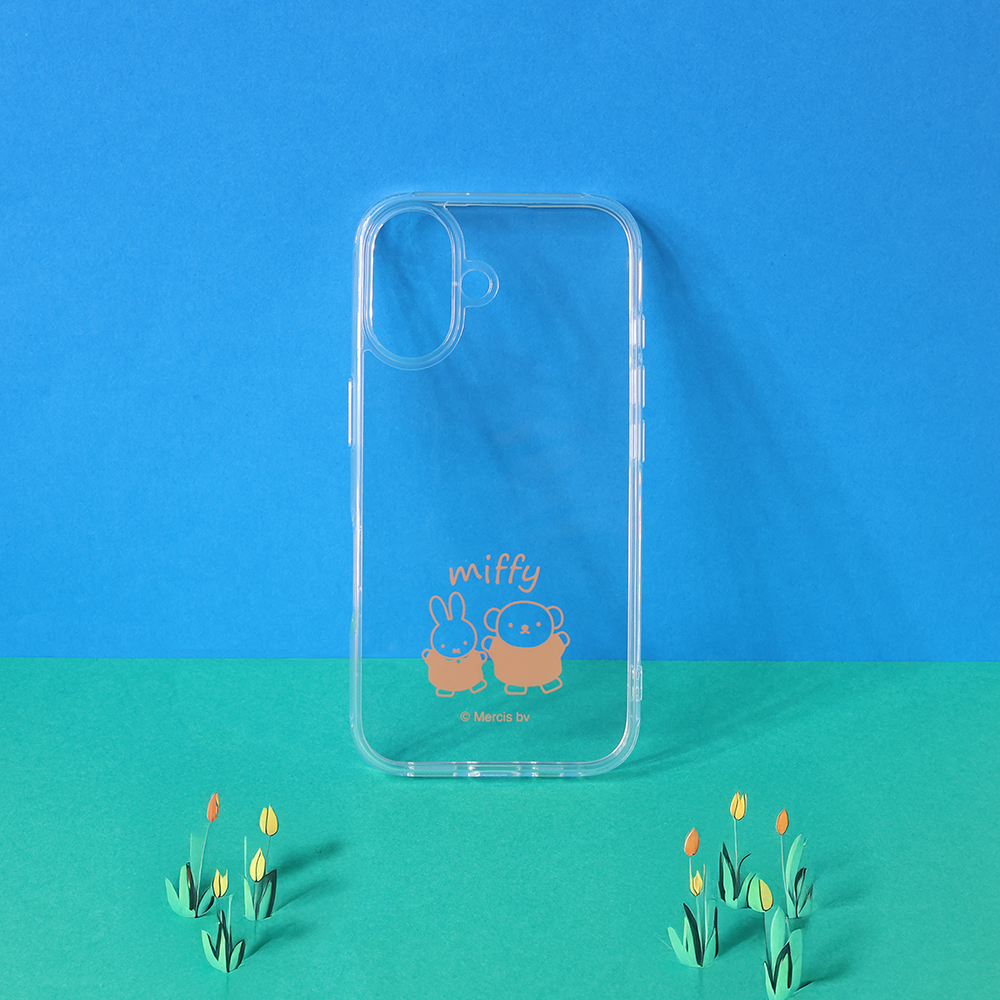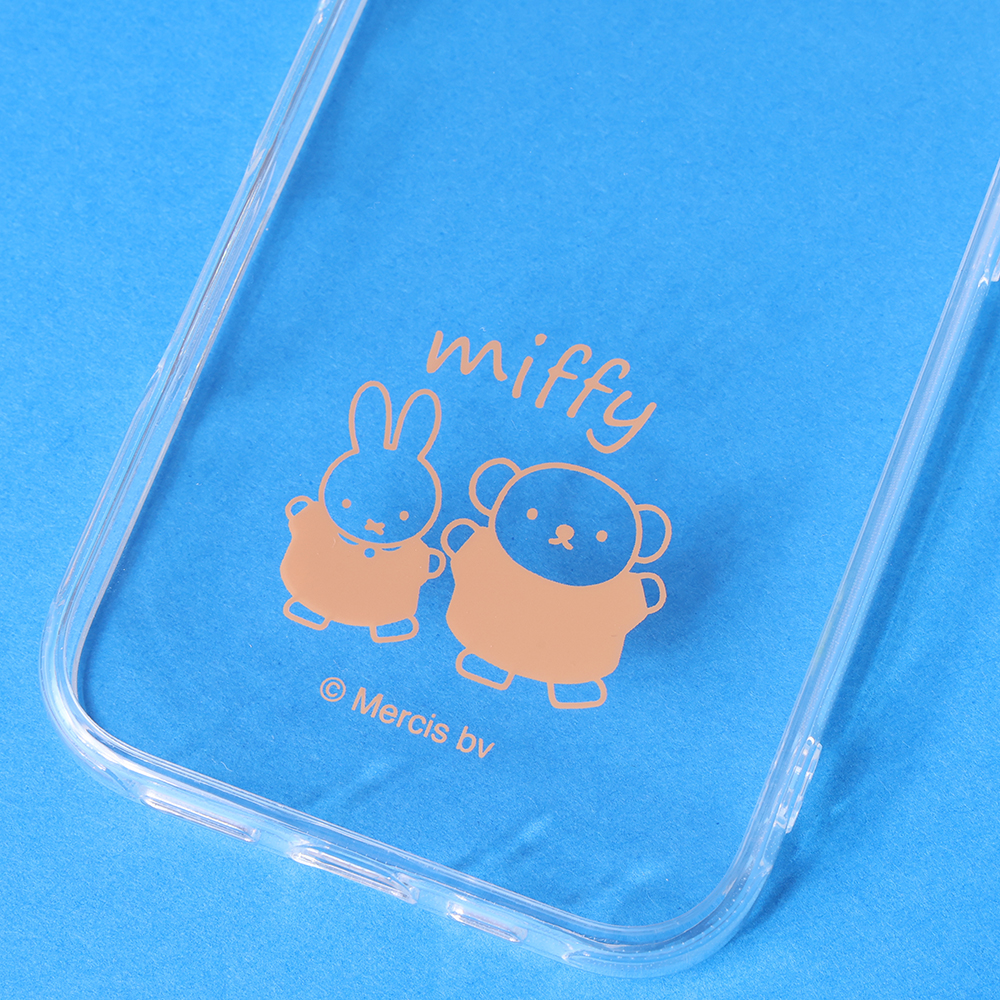仲良く並ぶミッフィーとボリスの可愛いらしいデザインが楽しめる透明感のあるハイブリッドケース。