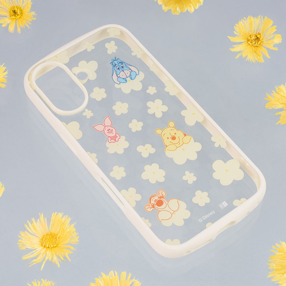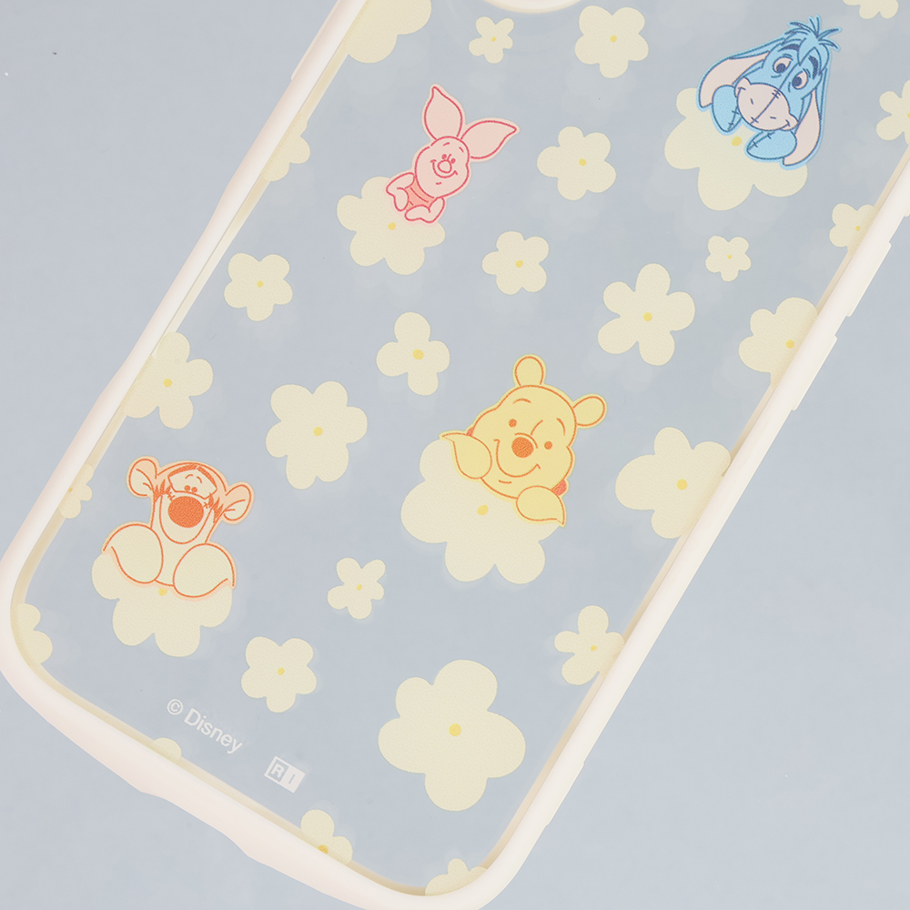 プーと仲間達が花に乗ってこちらを覗いているような可愛らしいデザインで、衝撃に強く、フィット感にも優れたハイブリッドケース。