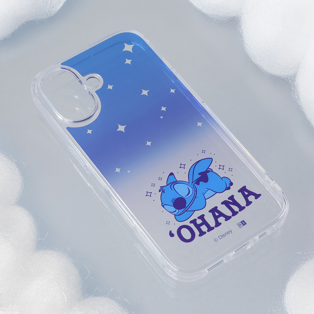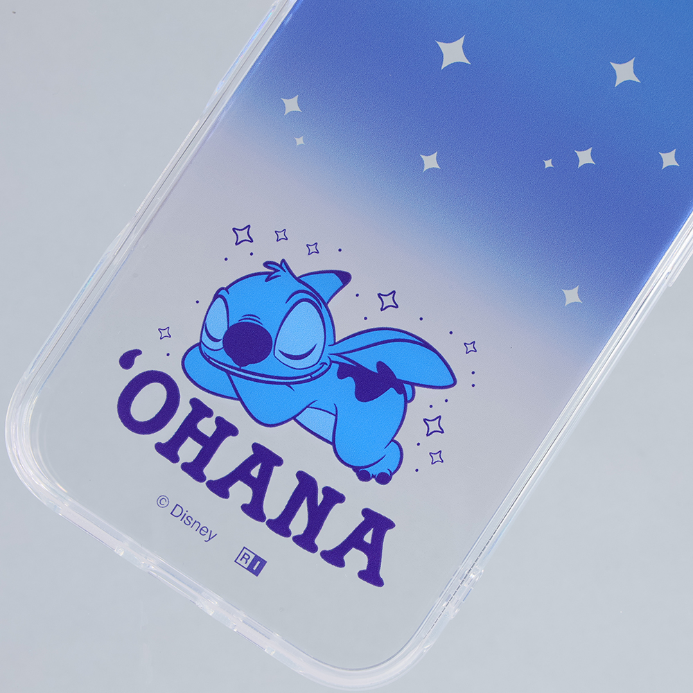 ビーチハウスの屋上にある展望台から見える星空のイメージと眠り姿のスティッチのデザインが楽しめる透明感のあるハイブリッドケース。