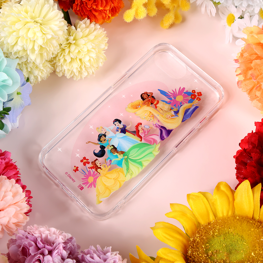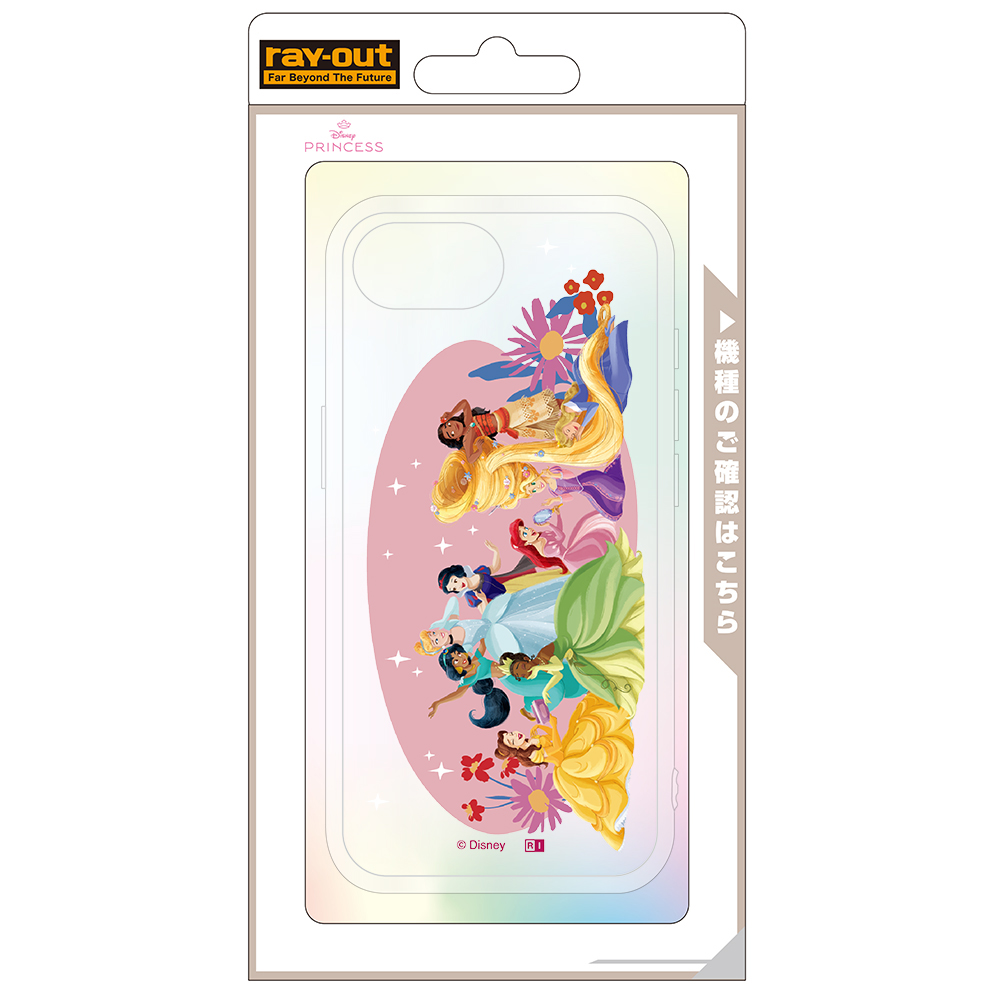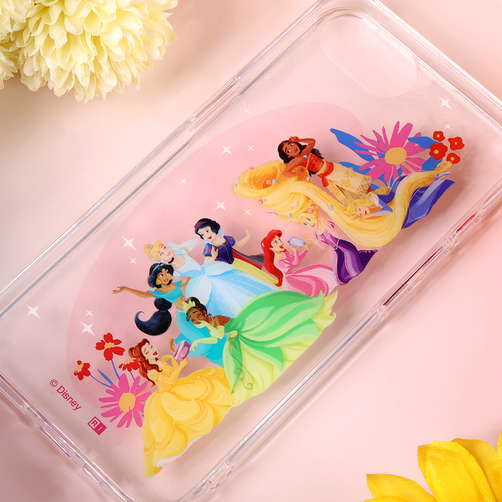 様々な作品のプリンセスが集合したアートを使用した可愛らしいデザインが楽しめる透明感のあるハイブリッドケース。