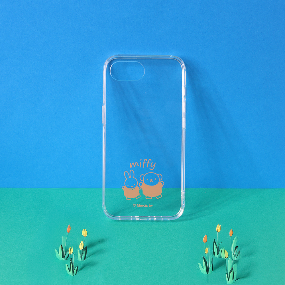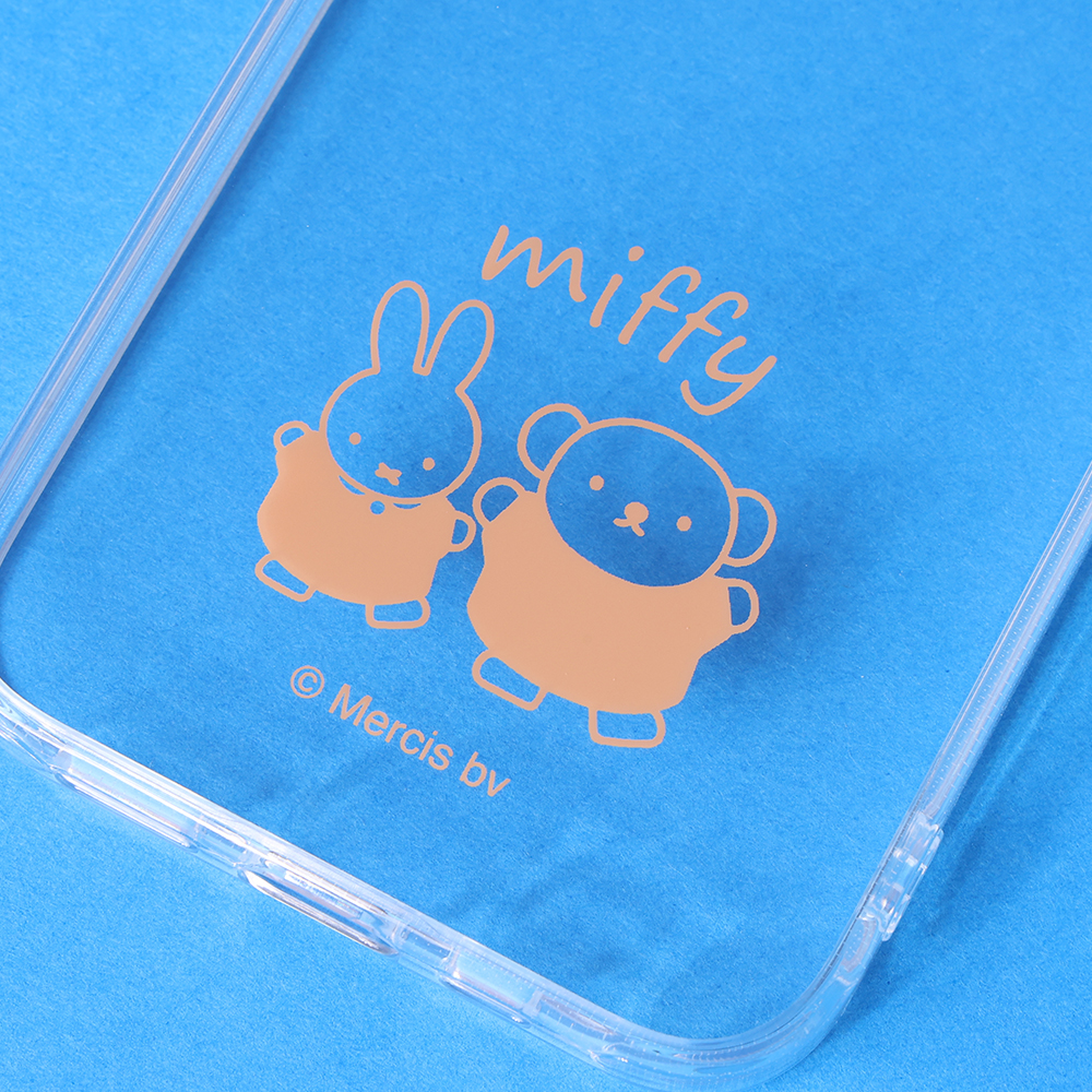 仲良く並ぶミッフィーとボリスの可愛いらしいデザインが楽しめる透明感のあるハイブリッドケース。
