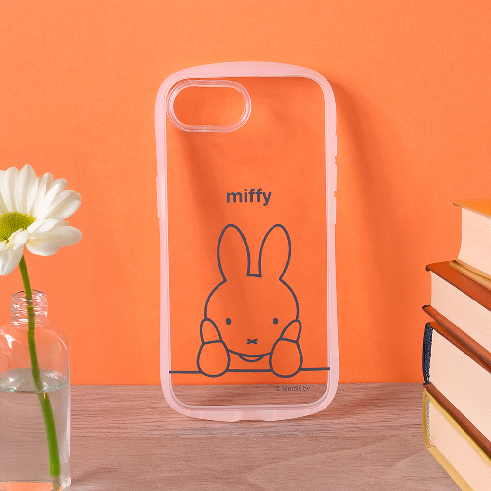 ほおづえをついている可愛いミッフィーが描かれたデザインと、衝撃に強い安心感を兼ね備えたハイブリッドケース。