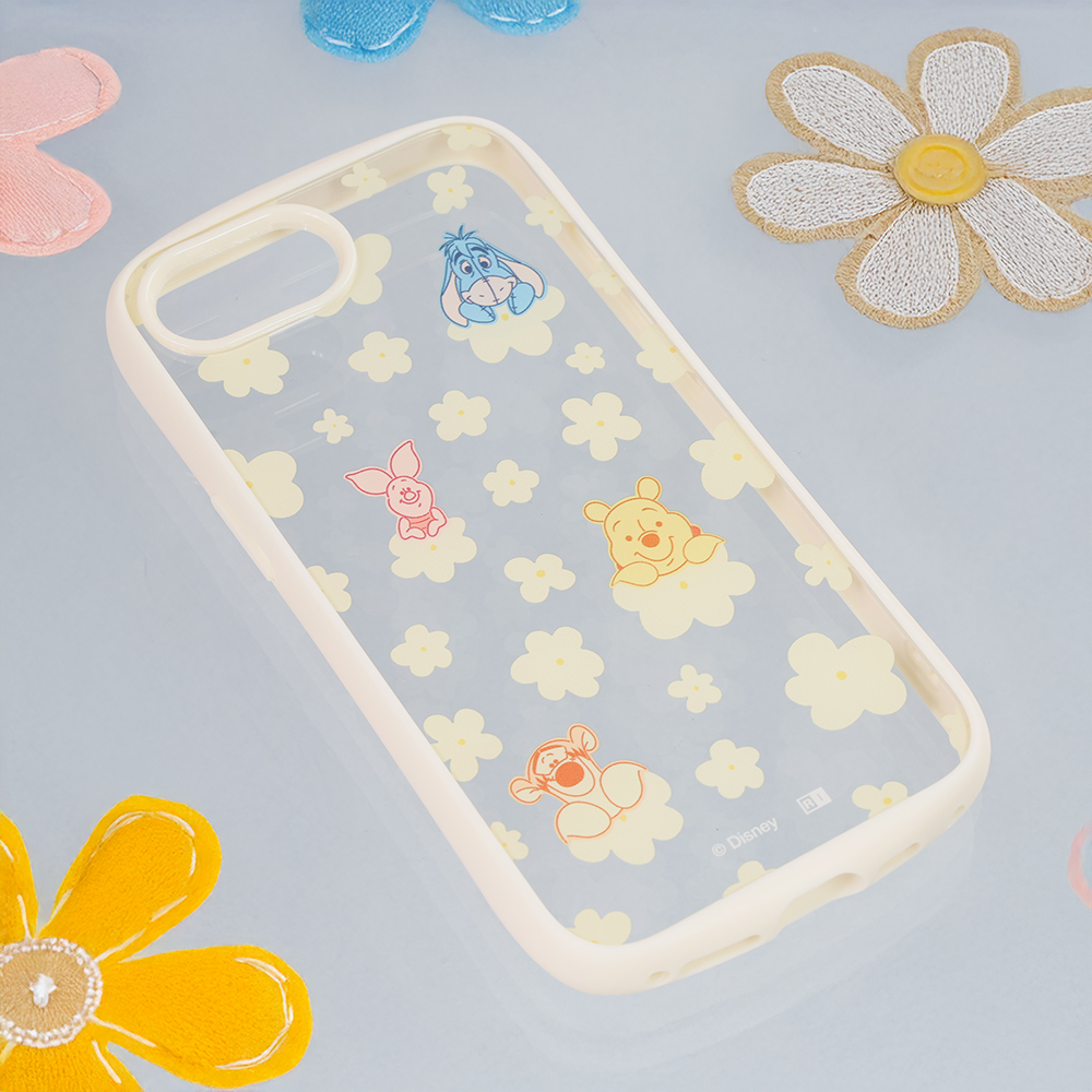 プーと仲間達が花に乗ってこちらを覗いているような可愛らしいデザインで、衝撃に強く、フィット感にも優れたハイブリッドケース。