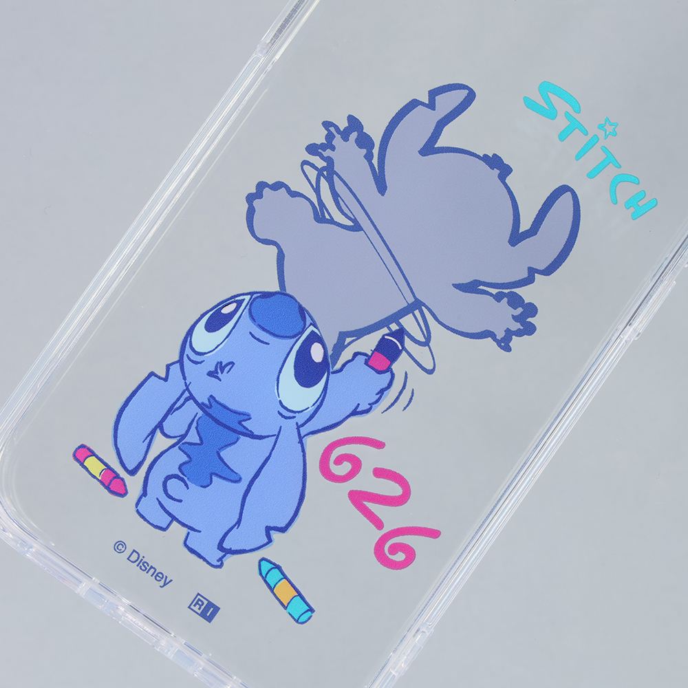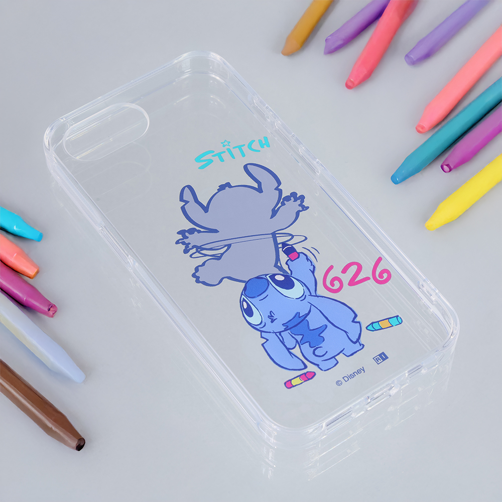 お絵描きが好きなスティッチが、自分自身を描いている、遊び心たっぷりのデザインが楽しめる透明感のあるハイブリッドケース。