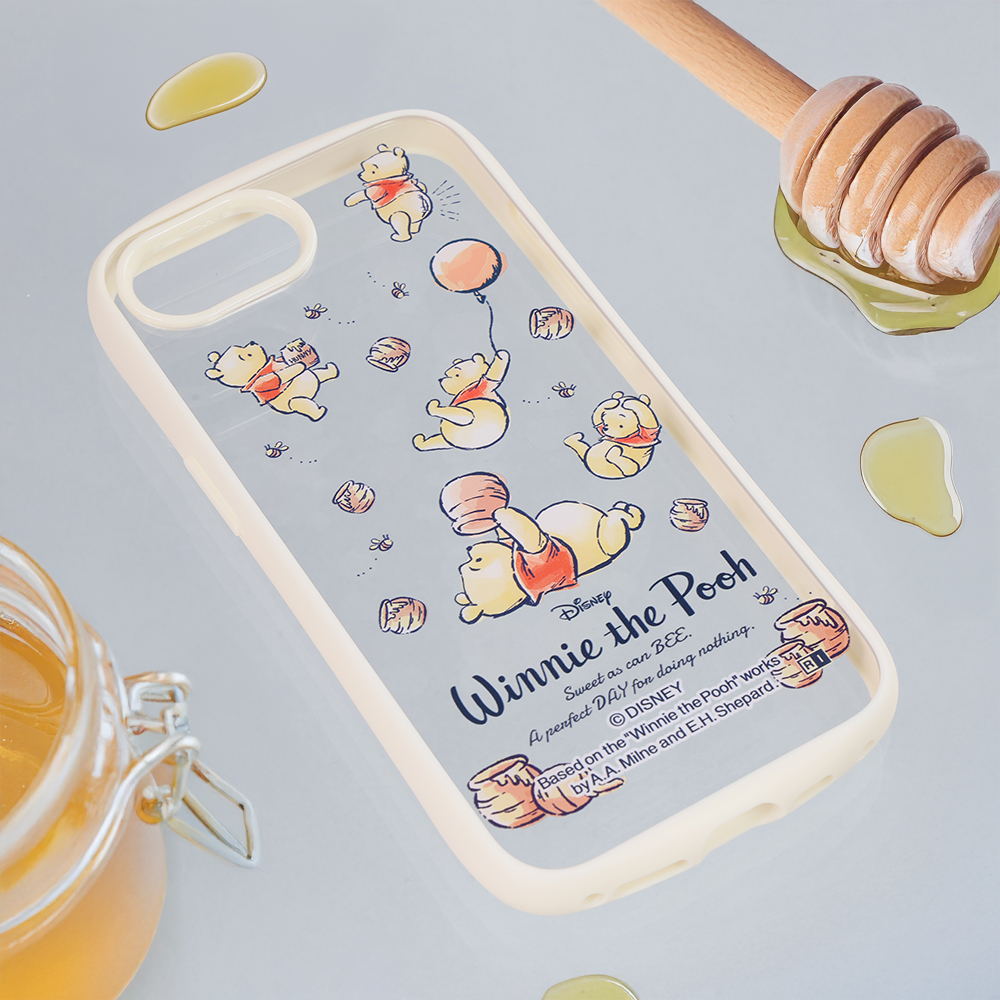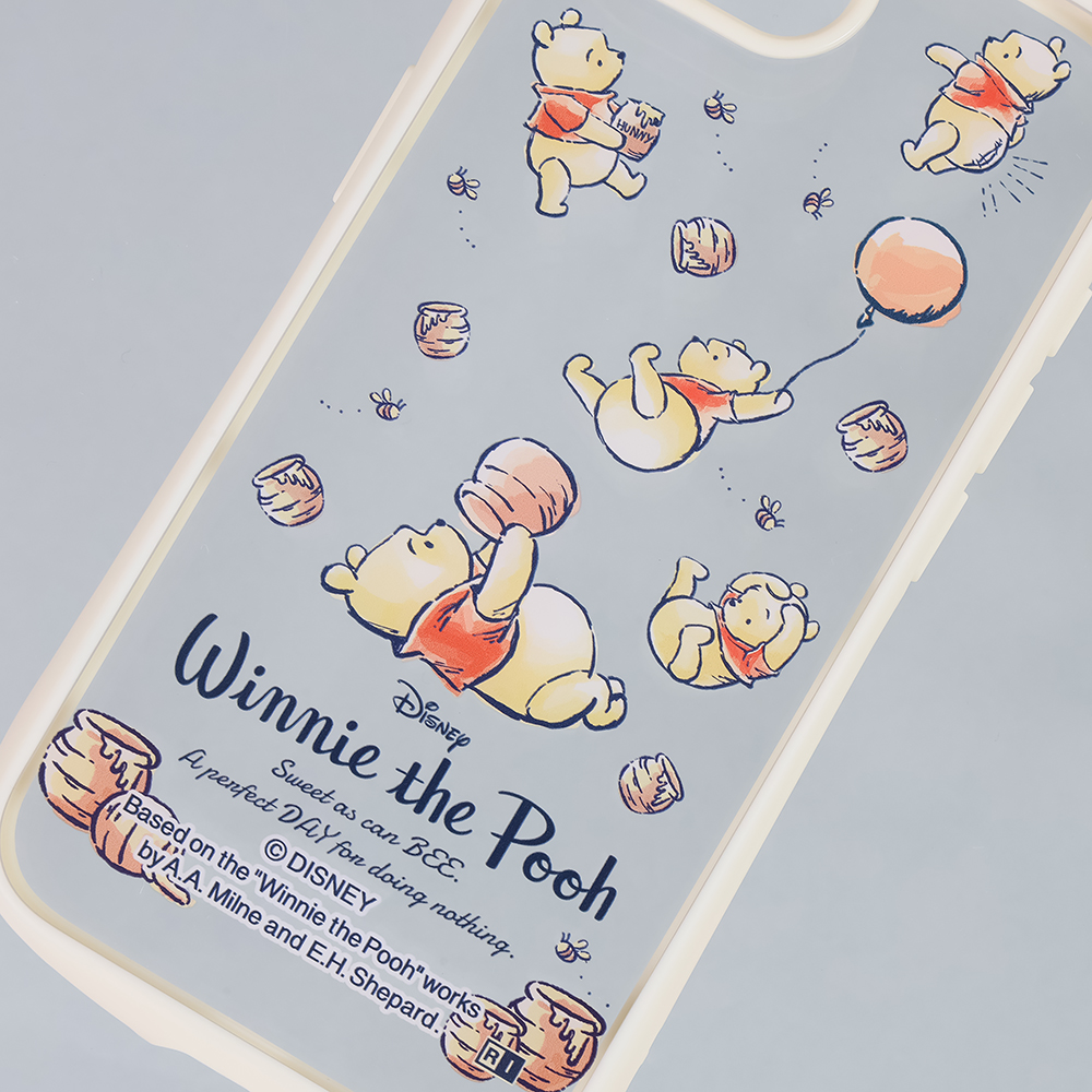 プーさんとはちみつの壺や風船などプーさんらしいアイテムを散りばめて心が和むようなデザインと、衝撃に強い安心感を兼ね備えたハイブリッドケース。
