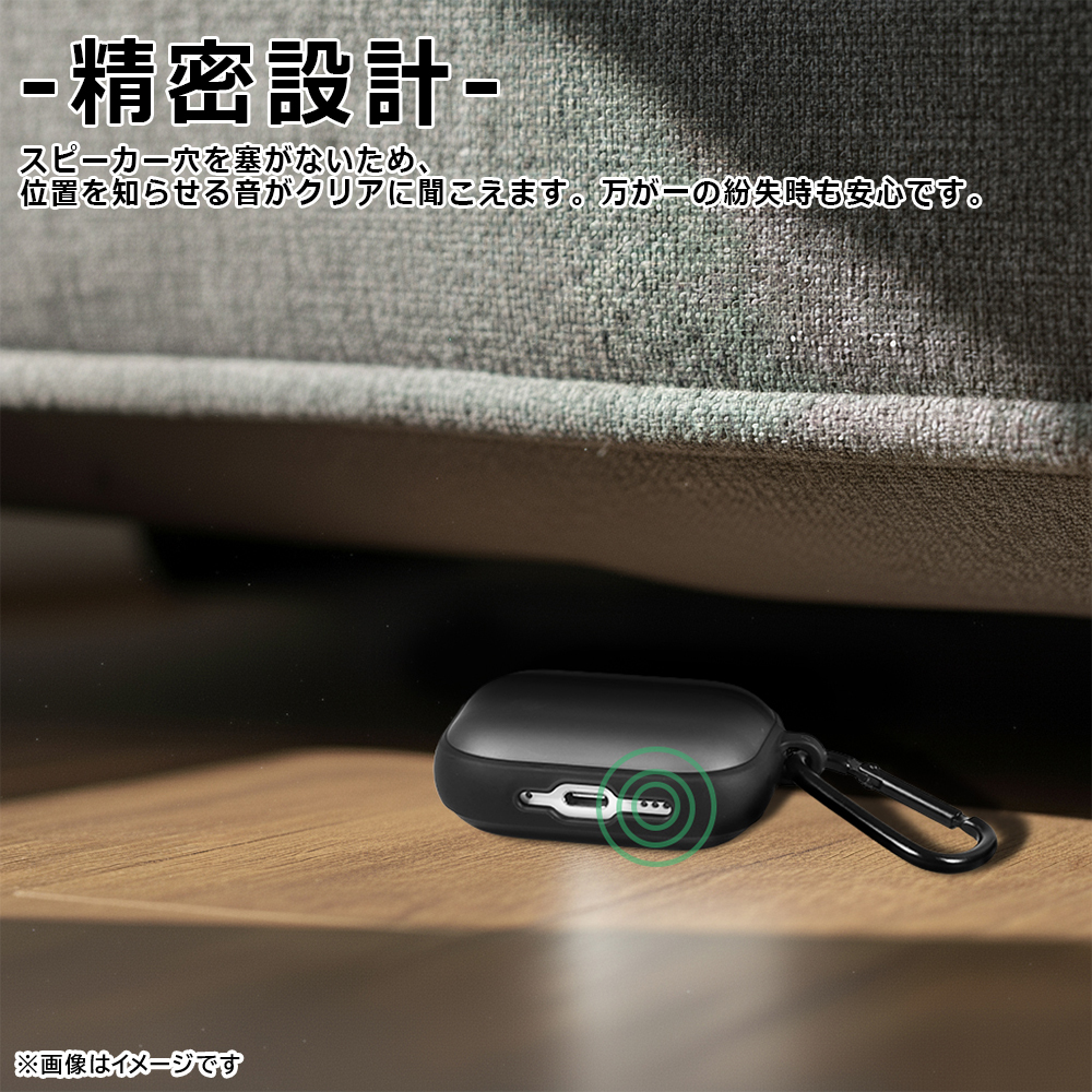 機能性も充実。ケースを装着したままワイヤレス充電に対応し、充電のたびにケースを取り外す手間がありません。持ち運びやバッグへの取り付けに便利なカラビナが付属しているため、紛失を防ぎ、外出先でも活躍します。