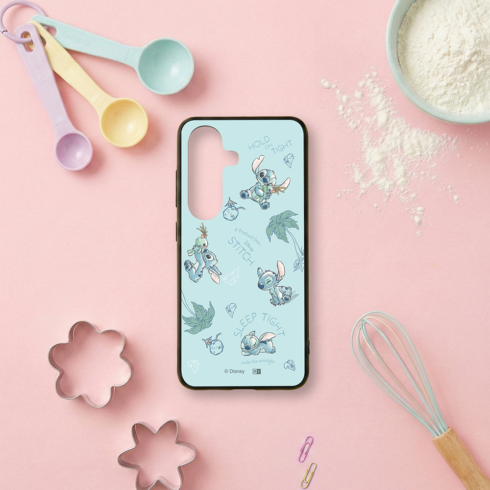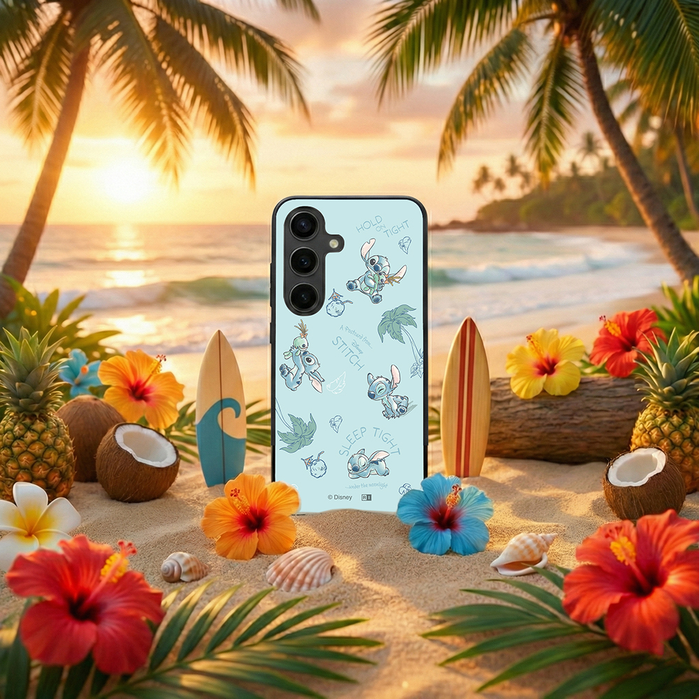 表面硬度2Hの背面に、スティッチがのんびり南国で楽しんでいる様子を表現したデザインをあしらったハイブリッドケース。