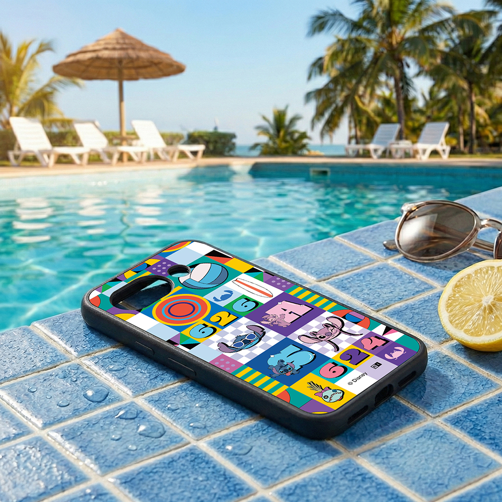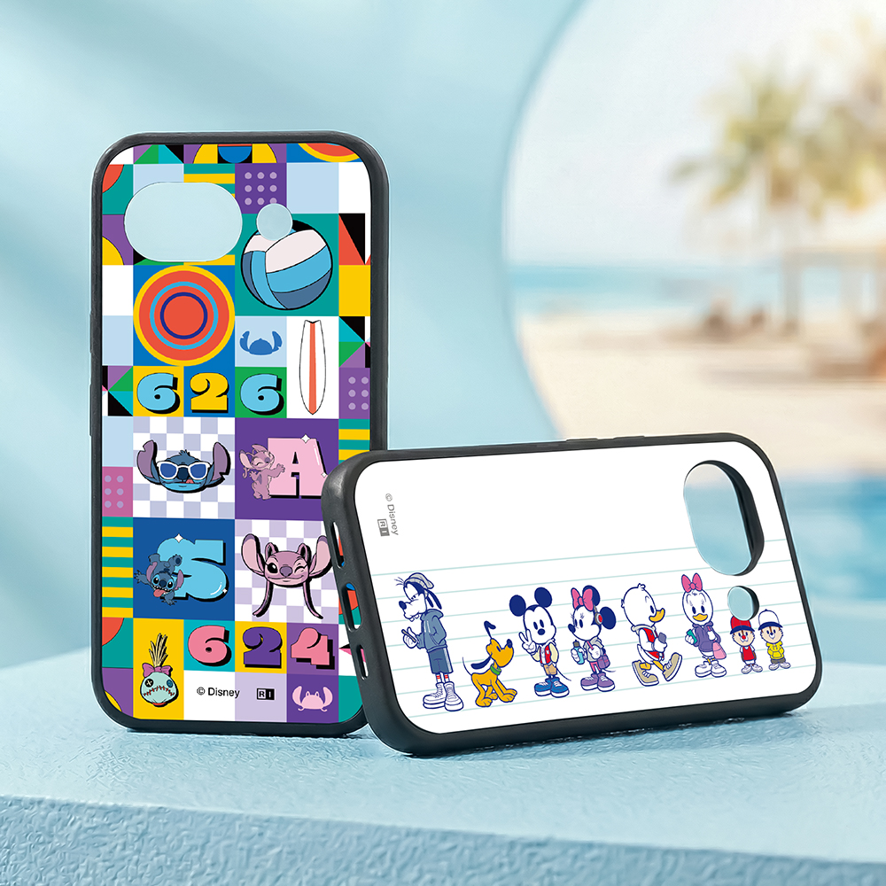表面硬度2Hの背面に、スティッチがのんびり南国で楽しんでいる様子を表現したデザインをあしらったハイブリッドケース。