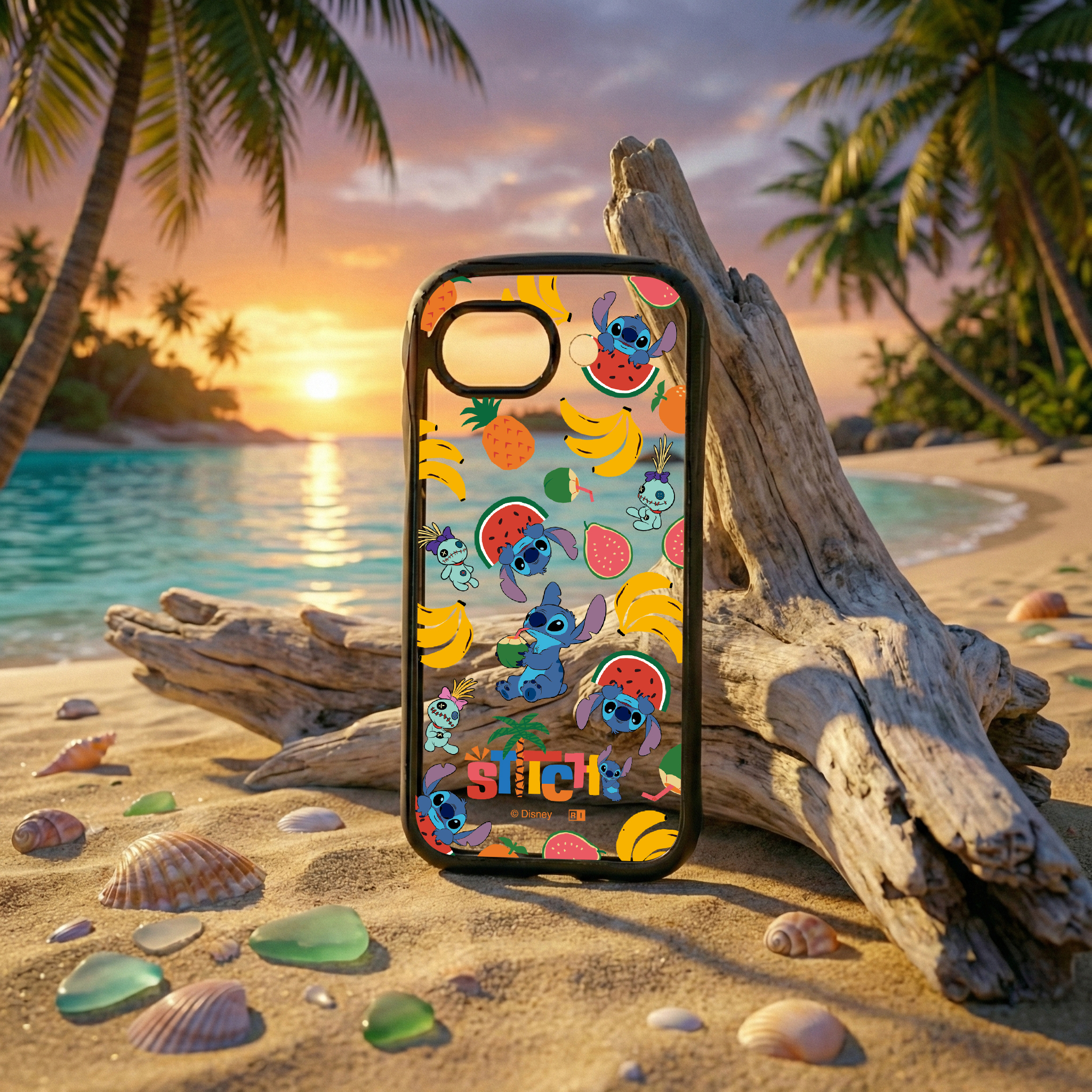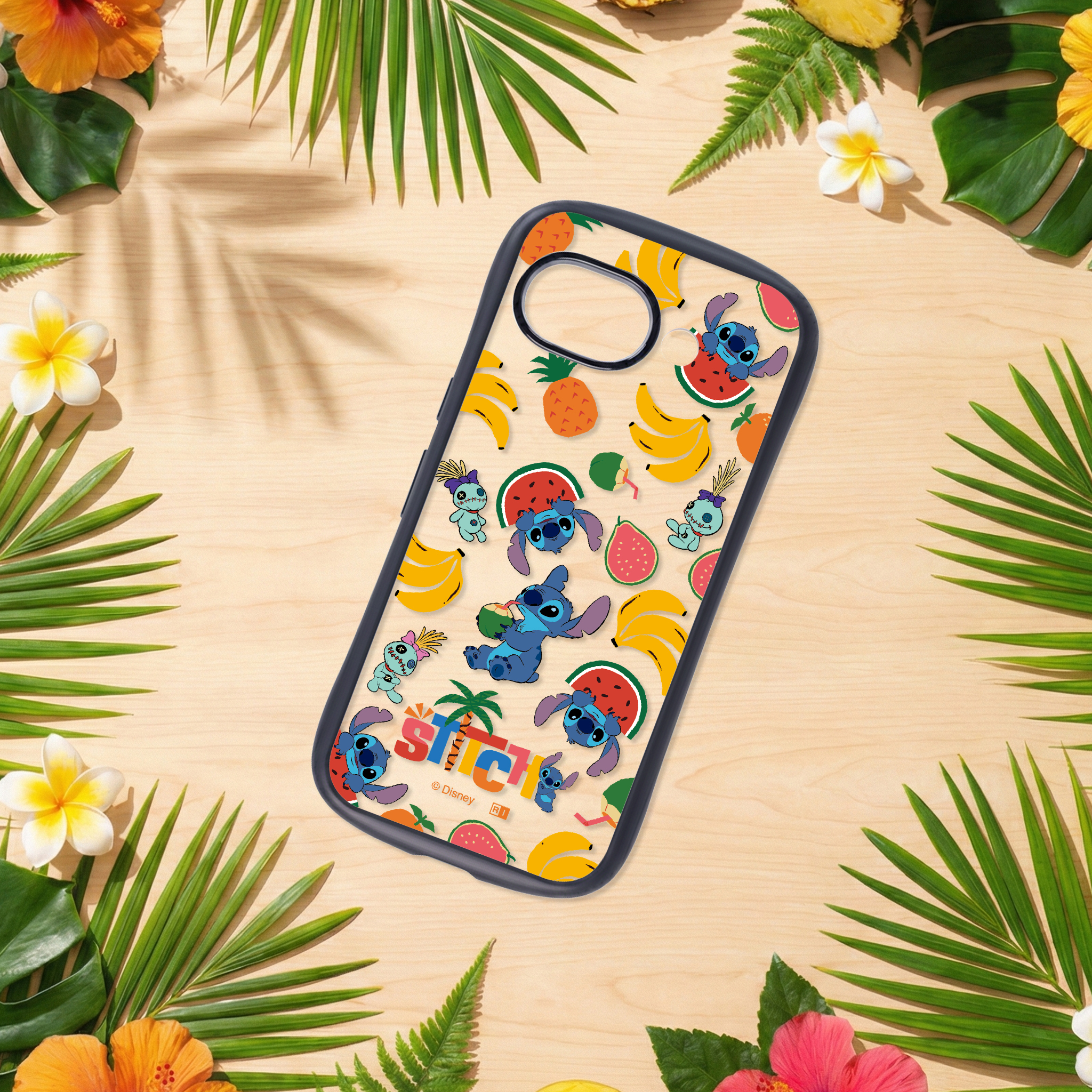 作中で人気のスクランプとスティッチの南国感溢れるトロピカルな総柄デザインと、衝撃に強い安心感を兼ね備えたハイブリッドケース。