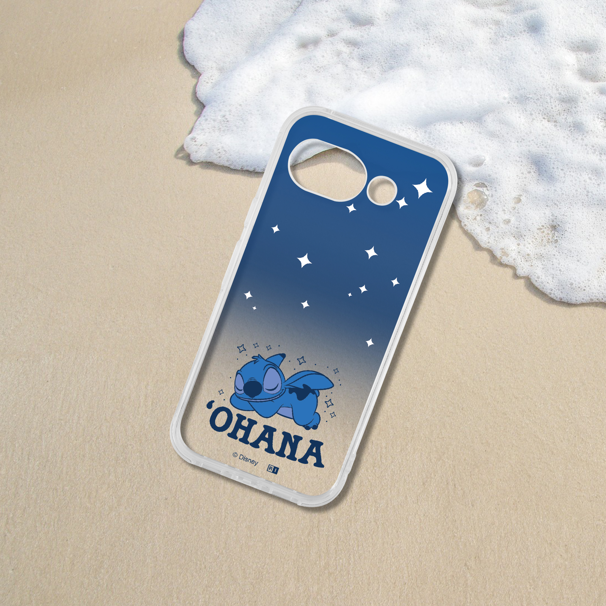 ビーチハウスの屋上にある展望台から見える星空のイメージと眠り姿のスティッチのデザインが楽しめる透明感のあるハイブリッドケース。