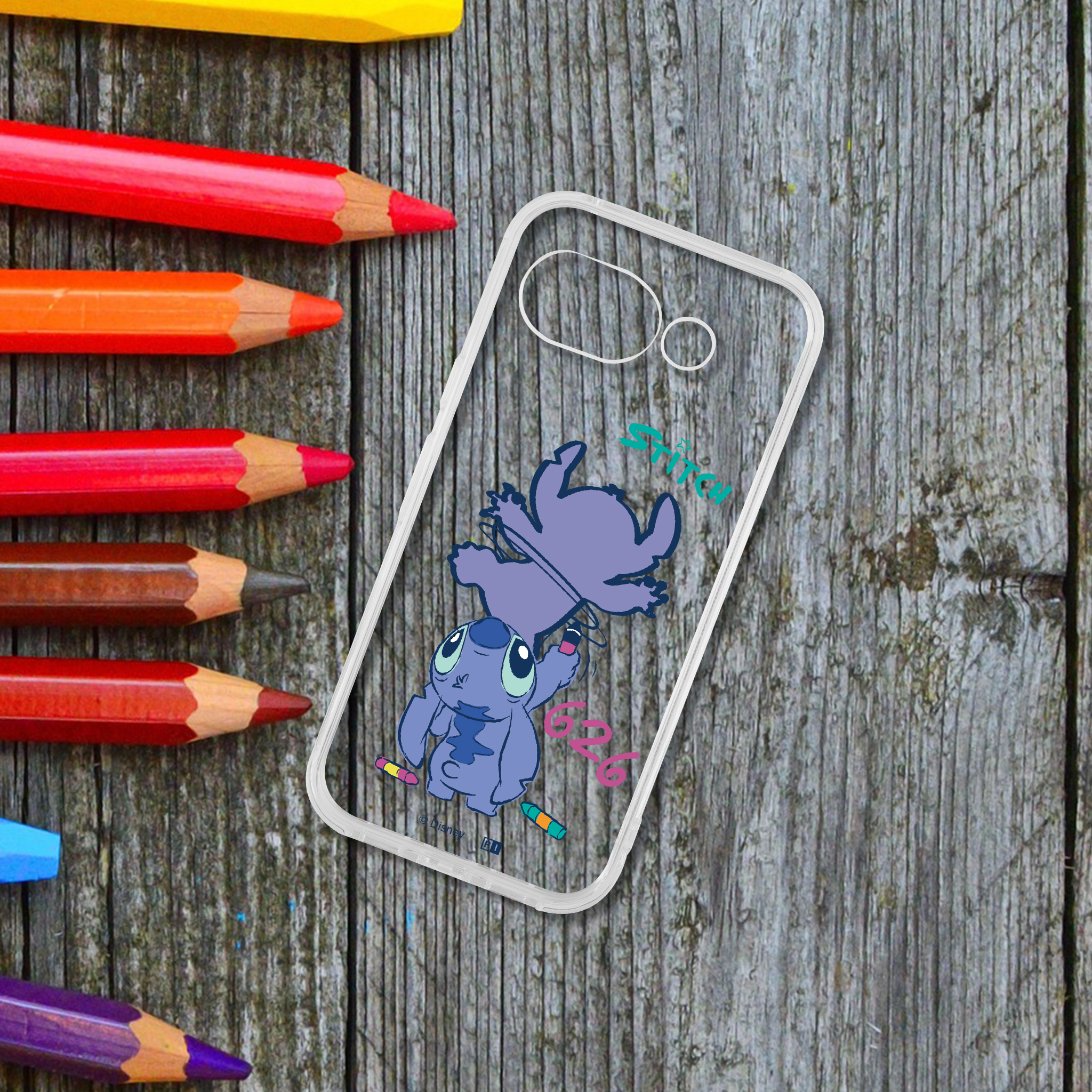 お絵描きが好きなスティッチが、自分自身を描いている、遊び心たっぷりのデザインが楽しめる透明感のあるハイブリッドケース。